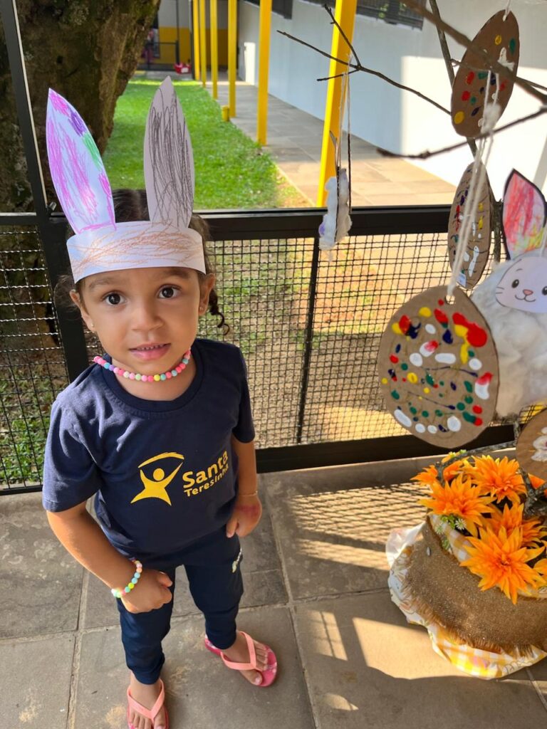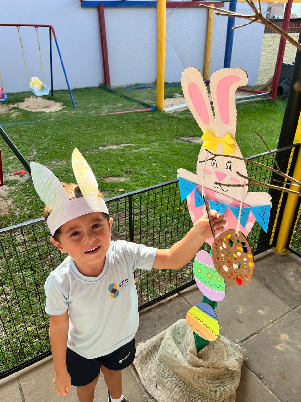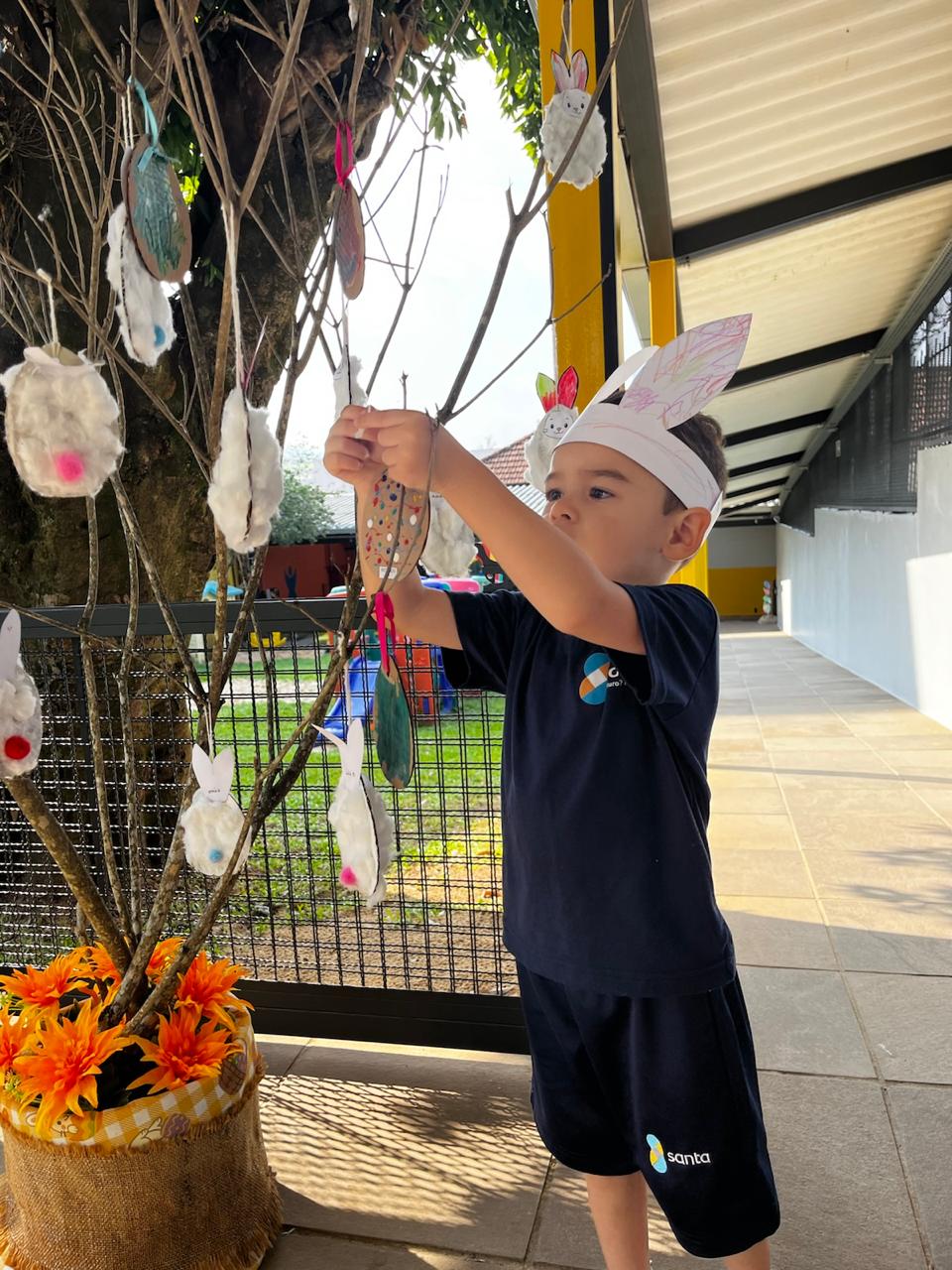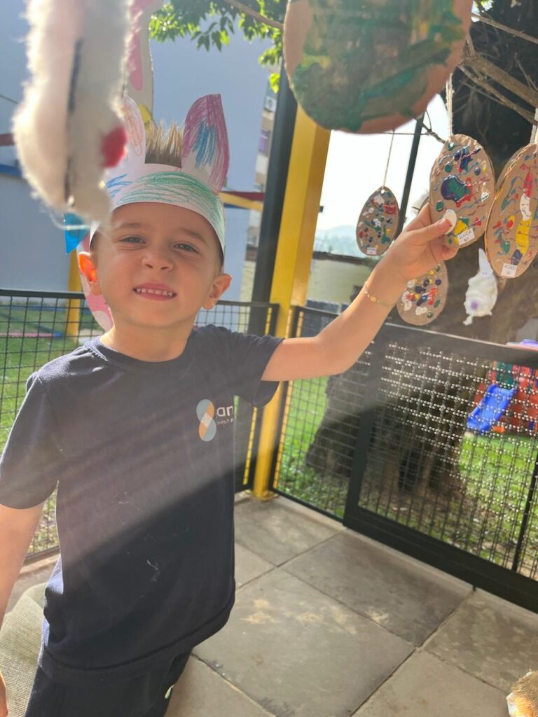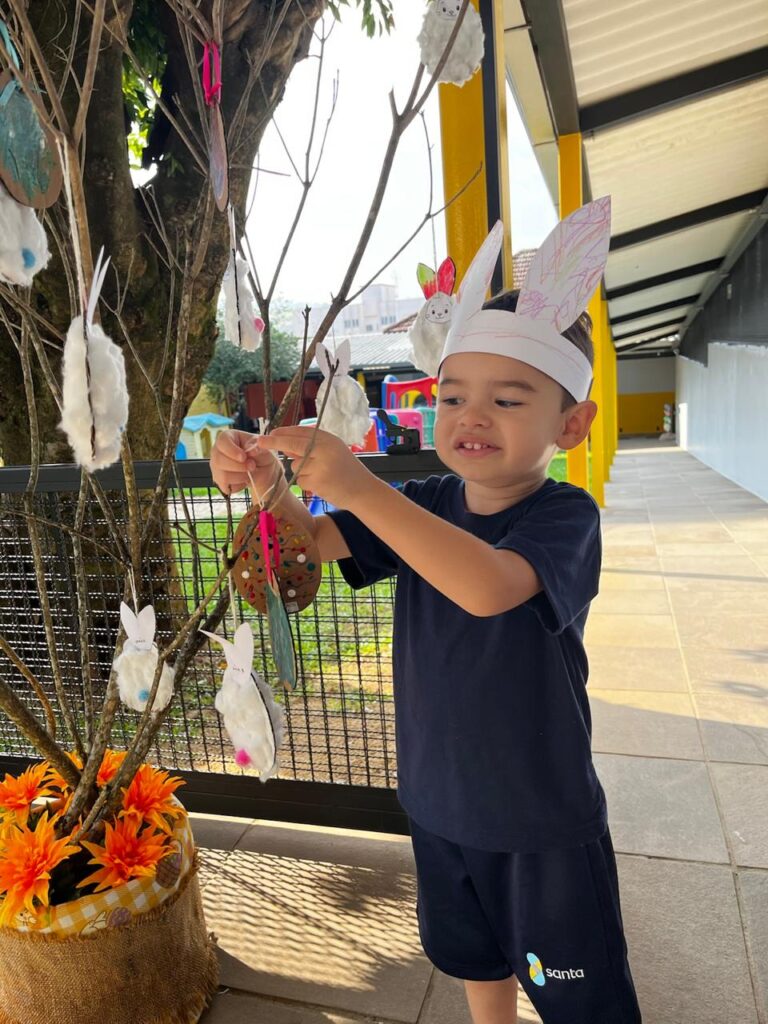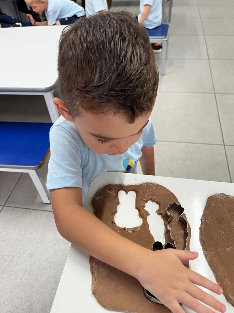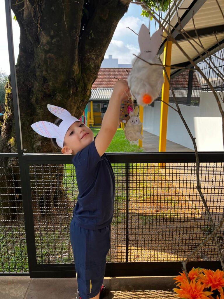 Fomos ajudantes do coelho, preparamos deliciosas bolachas e, ele nos devolveu todas lindas e coloridas. Também enfeitamos a escola com muito carinho para esperar a sua chegada. 🐰✨