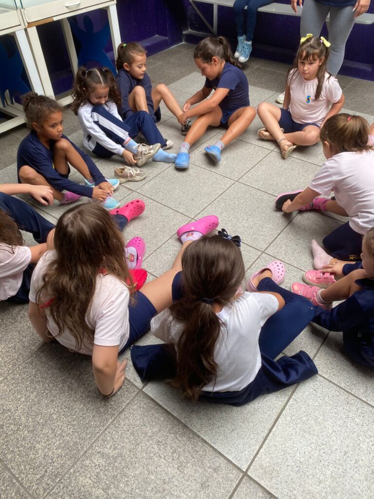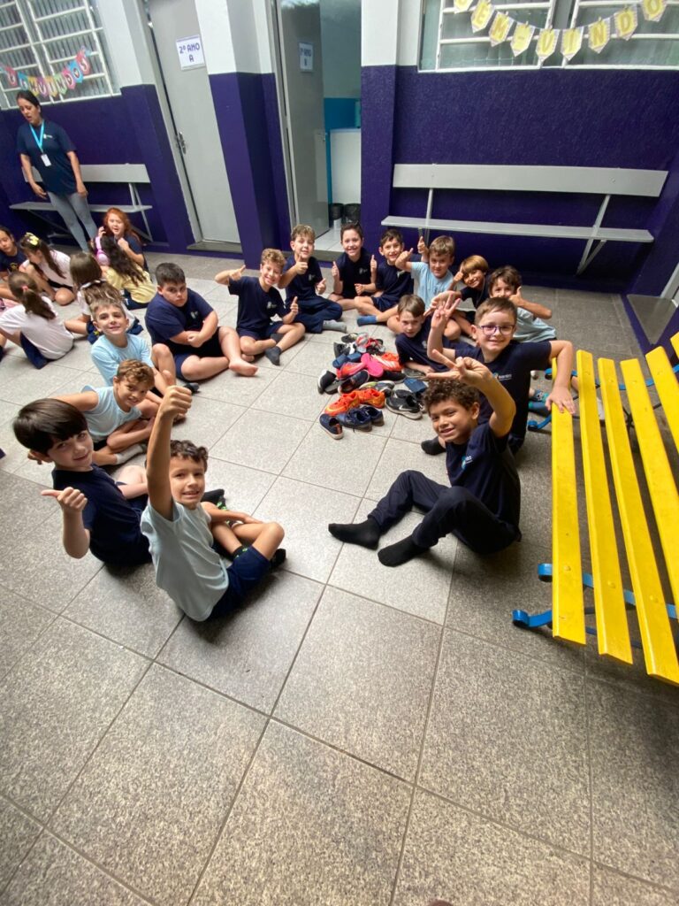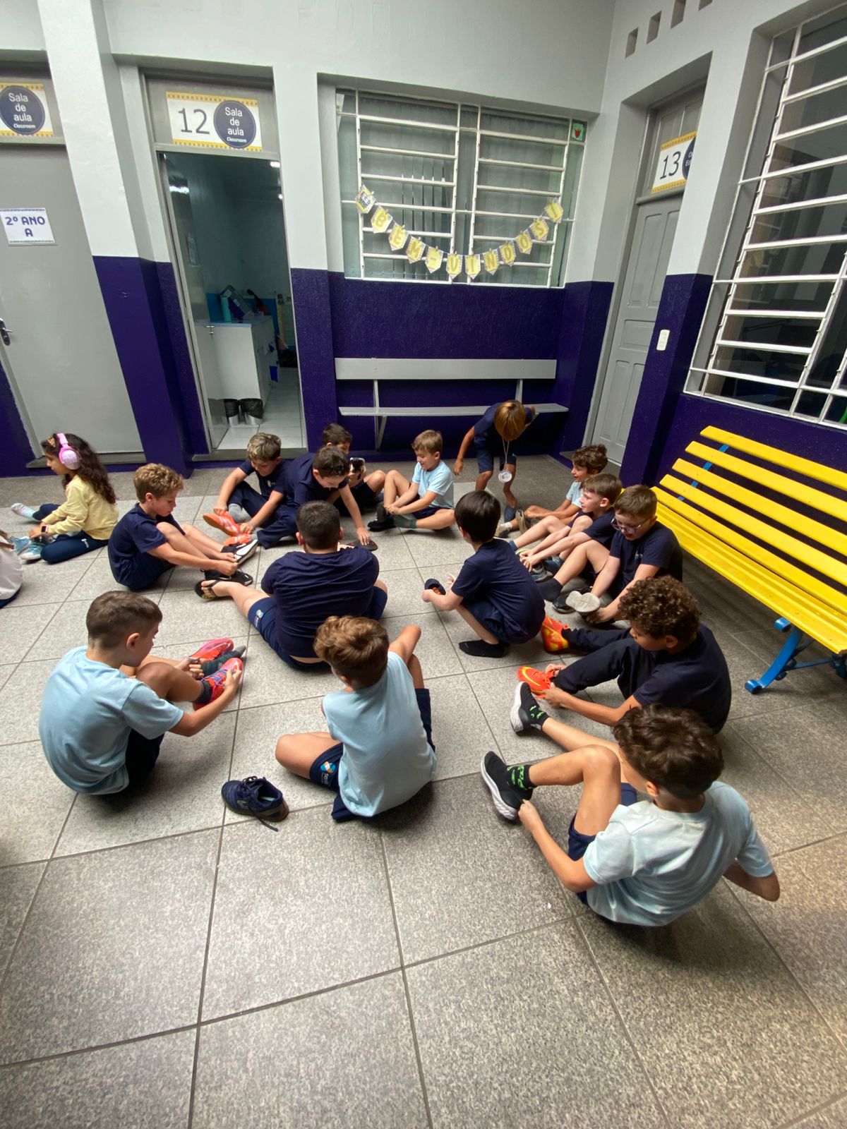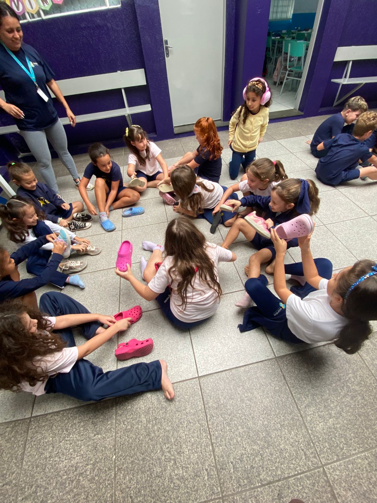 Ao som das orientações da professora, as crianças participaram de uma divertida dinâmica para encontrar o par correto de tênis, desenvolvendo de forma lúdica as noções de direita e esquerda. A atividade estimulou a atenção, a coordenação e o aprendizado por meio da brincadeira.