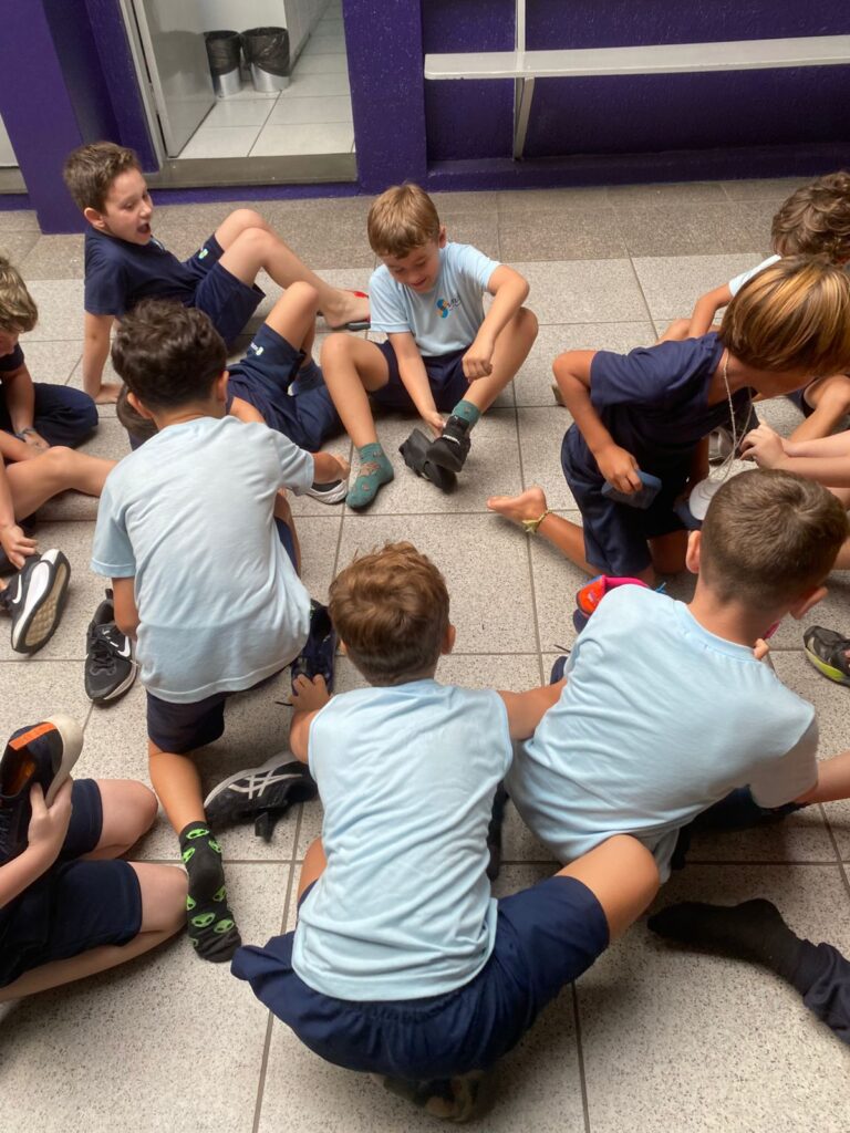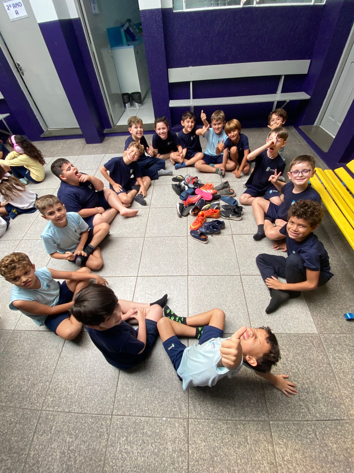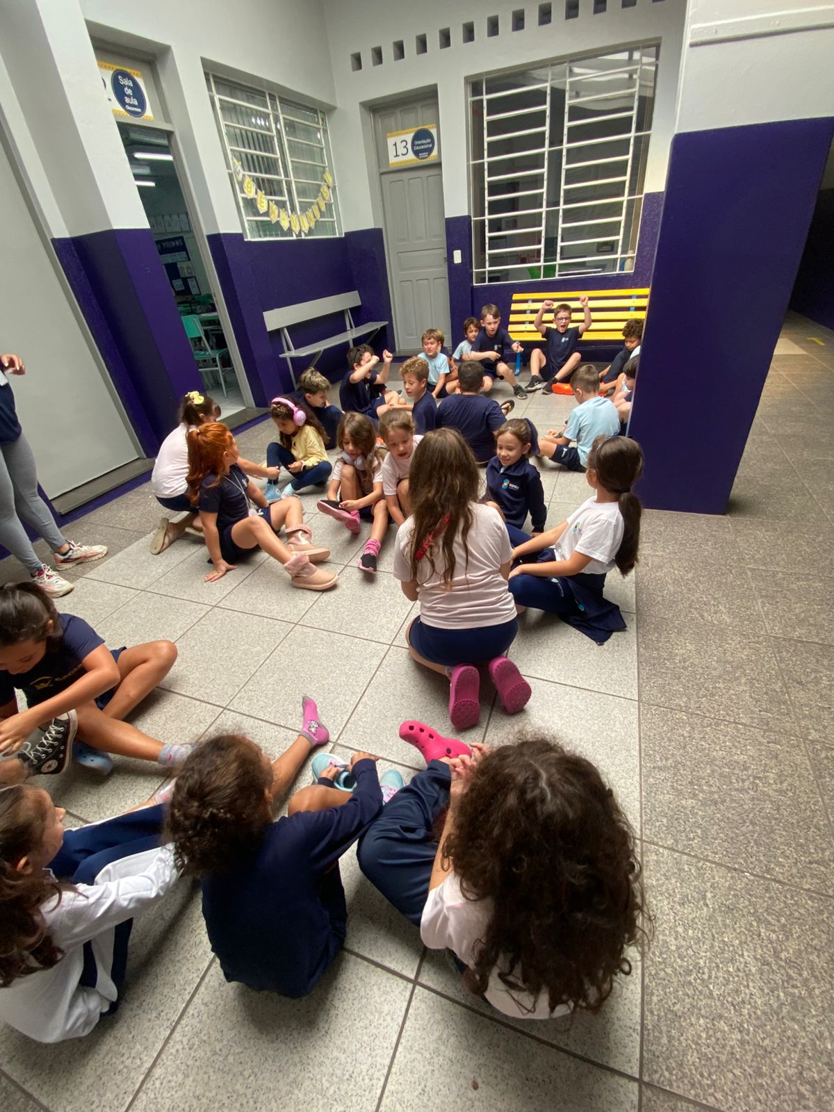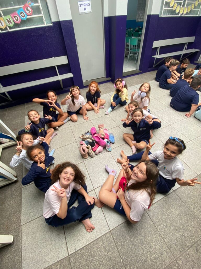 Ao som das orientações da professora, as crianças participaram de uma divertida dinâmica para encontrar o par correto de tênis, desenvolvendo de forma lúdica as noções de direita e esquerda. A atividade estimulou a atenção, a coordenação e o aprendizado por meio da brincadeira.