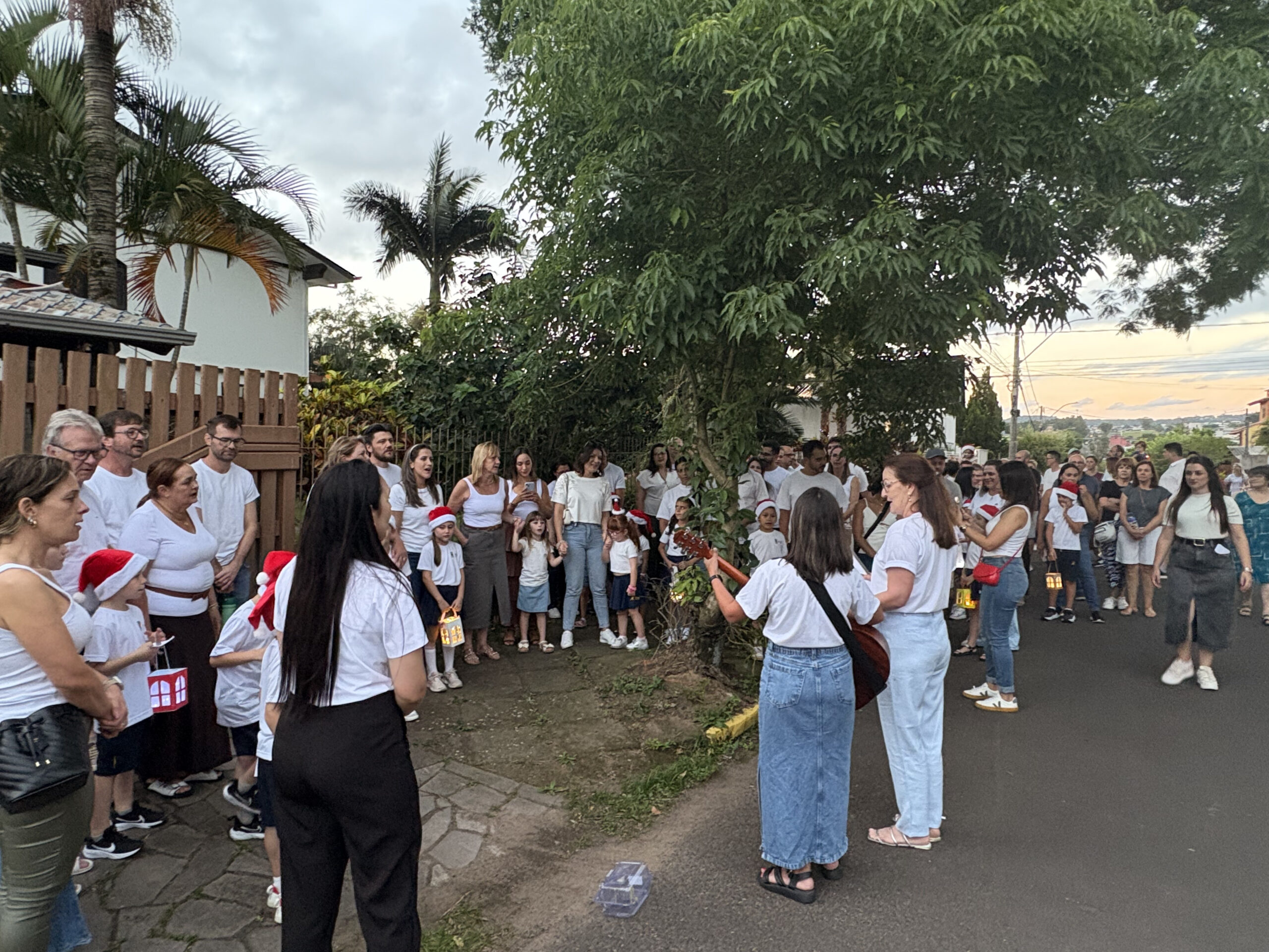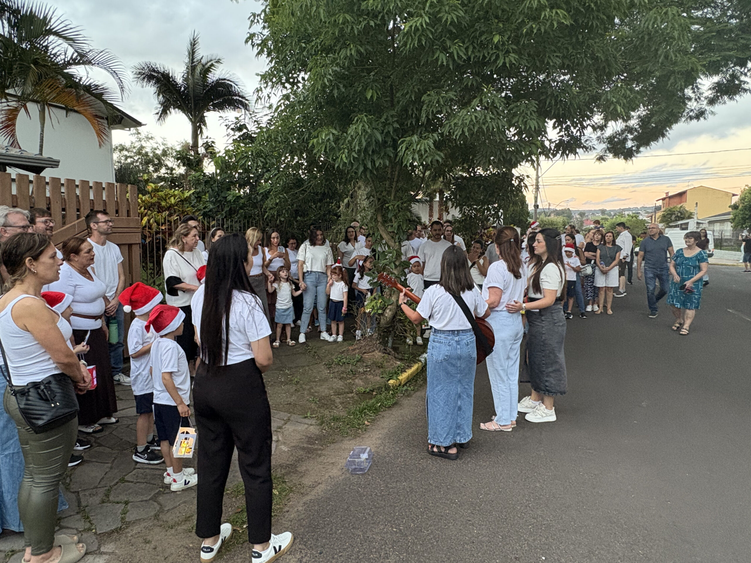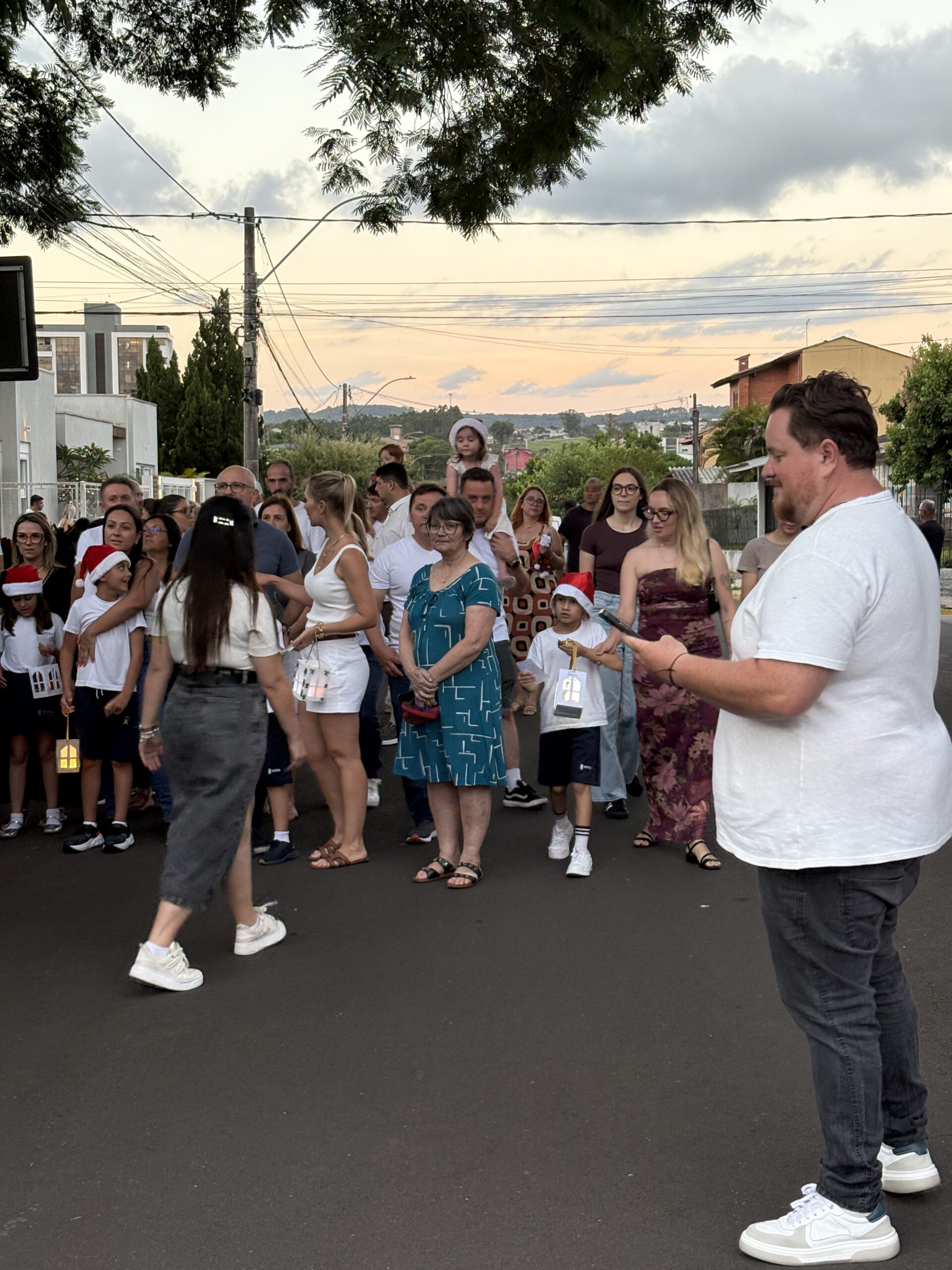 O encontro teve início na escola, com uma bela apresentação das crianças, que encantaram o público e prepararam os corações para a caminhada. Em seguida, alunos e familiares seguiram pelas ruas, cantando juntos e iluminando o caminho, em um gesto de união, fé e amor. Cada passo foi acompanhado por olhares atentos, vozes emocionadas e muita alegria compartilhada.