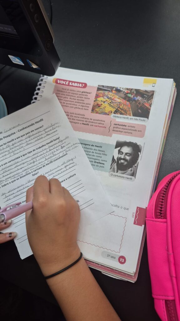 Os alunos realizaram uma pesquisa sobre os trabalhos do cartunista Henfil, conhecendo suas charges, personagens e a forma como ele utilizava o humor para falar de assuntos importantes da sociedade. Uma aula de investigação, aprendizado e muita curiosidade