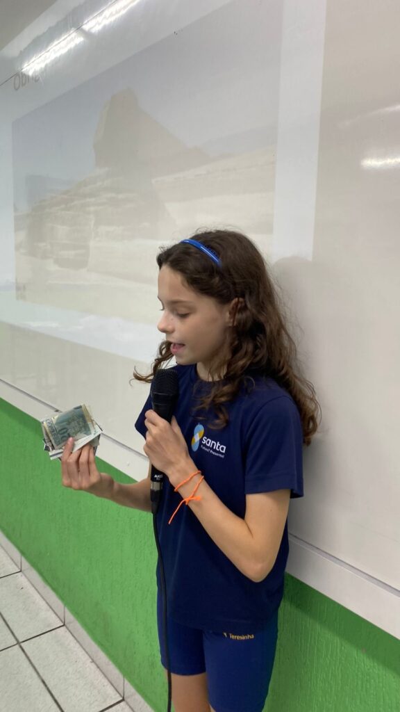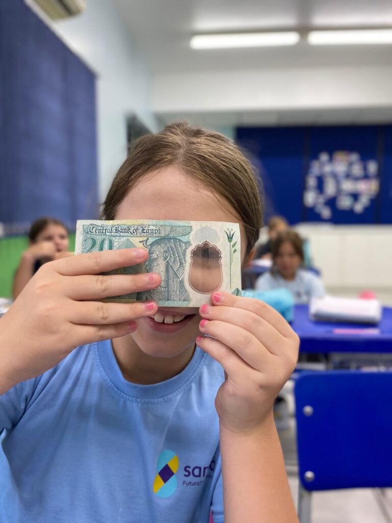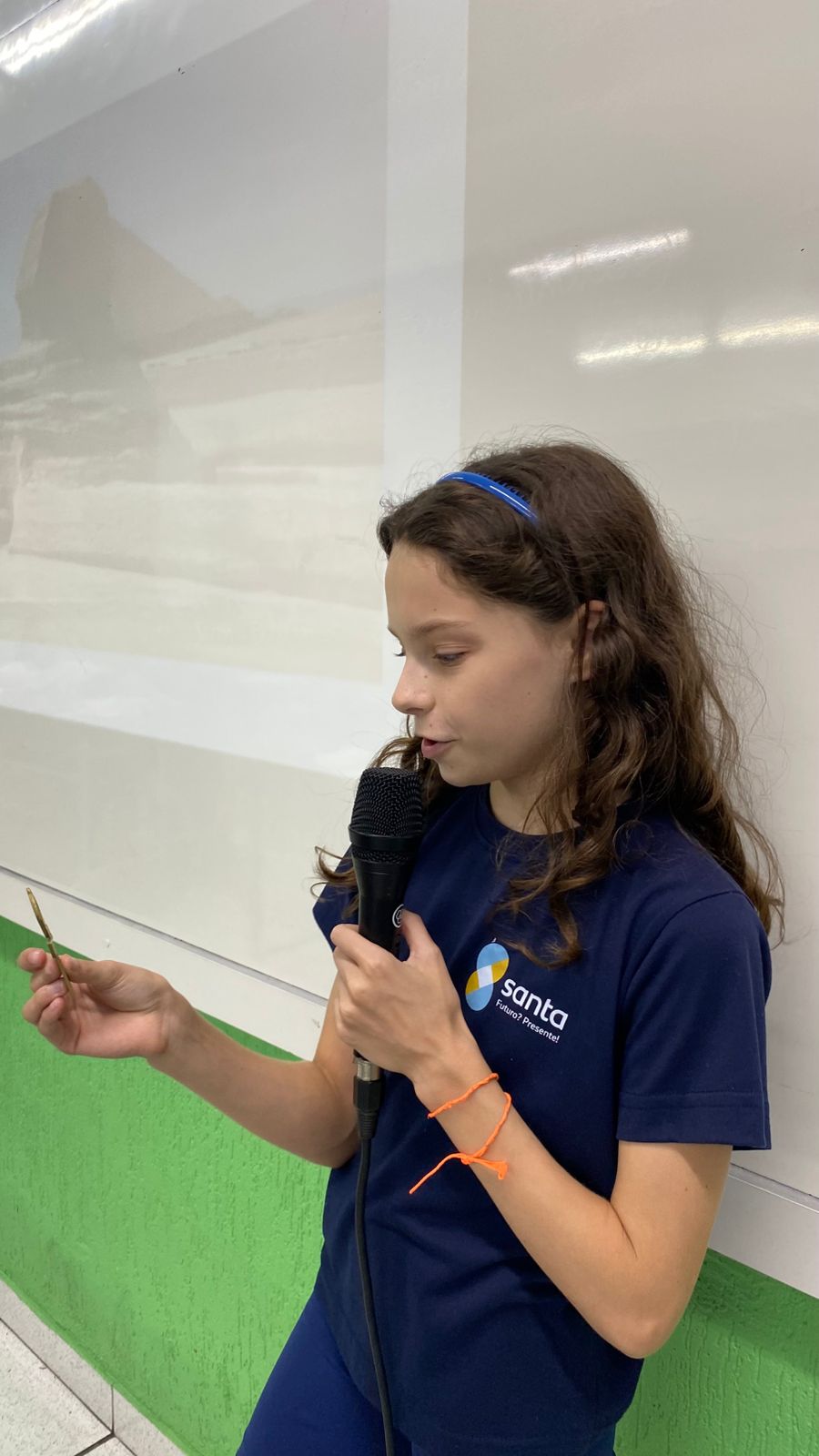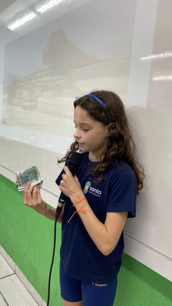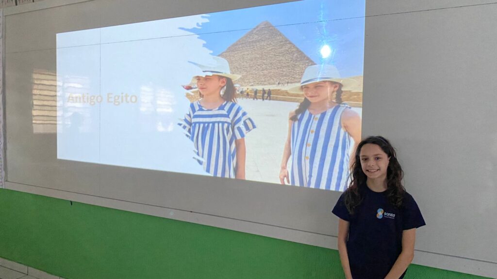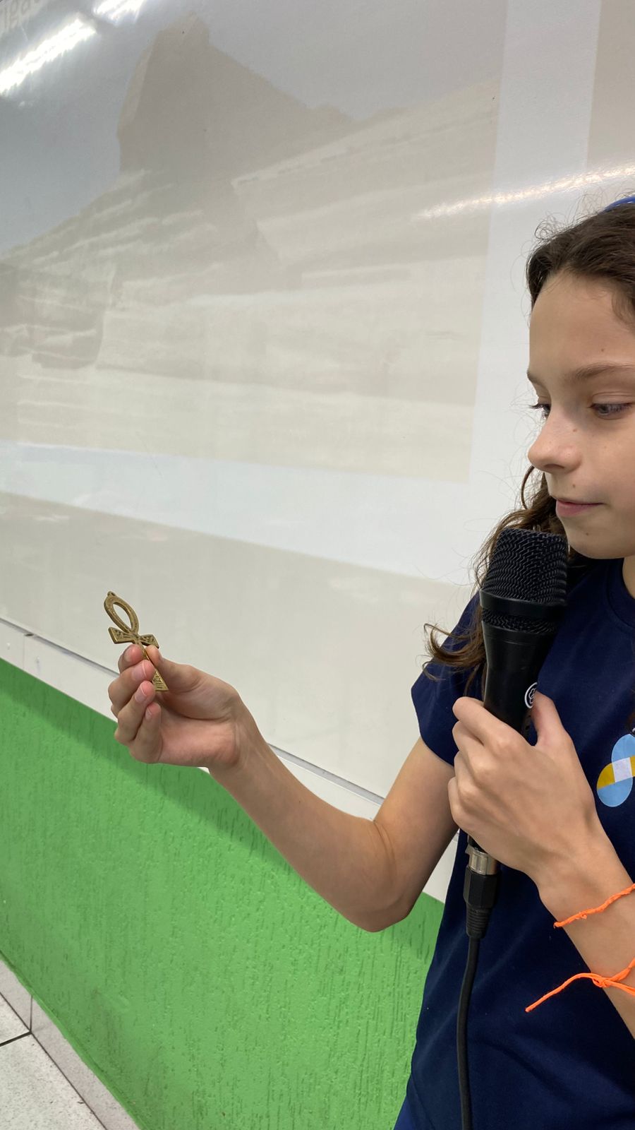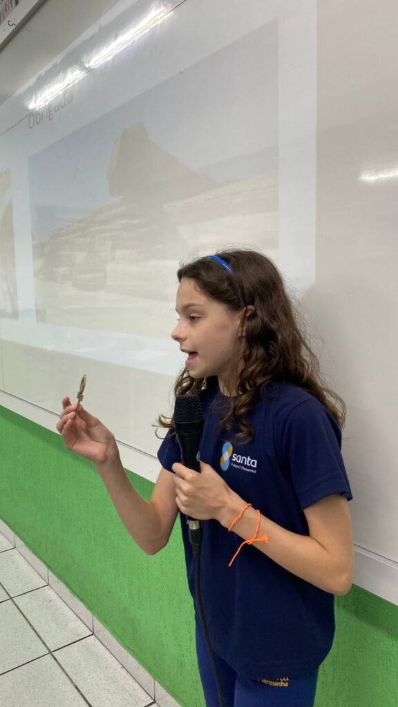 Nesse contexto, a estudante Ingrid, junto de sua família, realizou uma viagem ao Egito e teve a oportunidade de vivenciar de perto muitos dos aspectos que estamos aprendendo em sala. Para enriquecer ainda mais o aprendizado da turma, ela compartilhou sua experiência com os colegas por meio de uma apresentação, na qual contou curiosidades sobre o passeio, mostrando lugares visitados e trazendo objetos da cultura egípcia.
