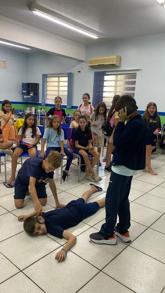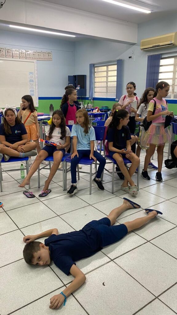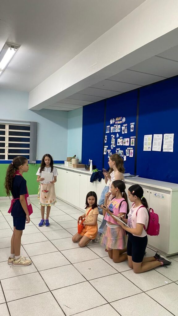 Como fechamento do capítulo, os alunos, organizados em grupos, criaram seus próprios roteiros de peças teatrais, exercitando a criatividade, a escrita e o trabalho em equipe. Em seguida, realizaram a apresentação das peças para os colegas, colocando em prática a expressão oral, a interpretação e a cooperação.