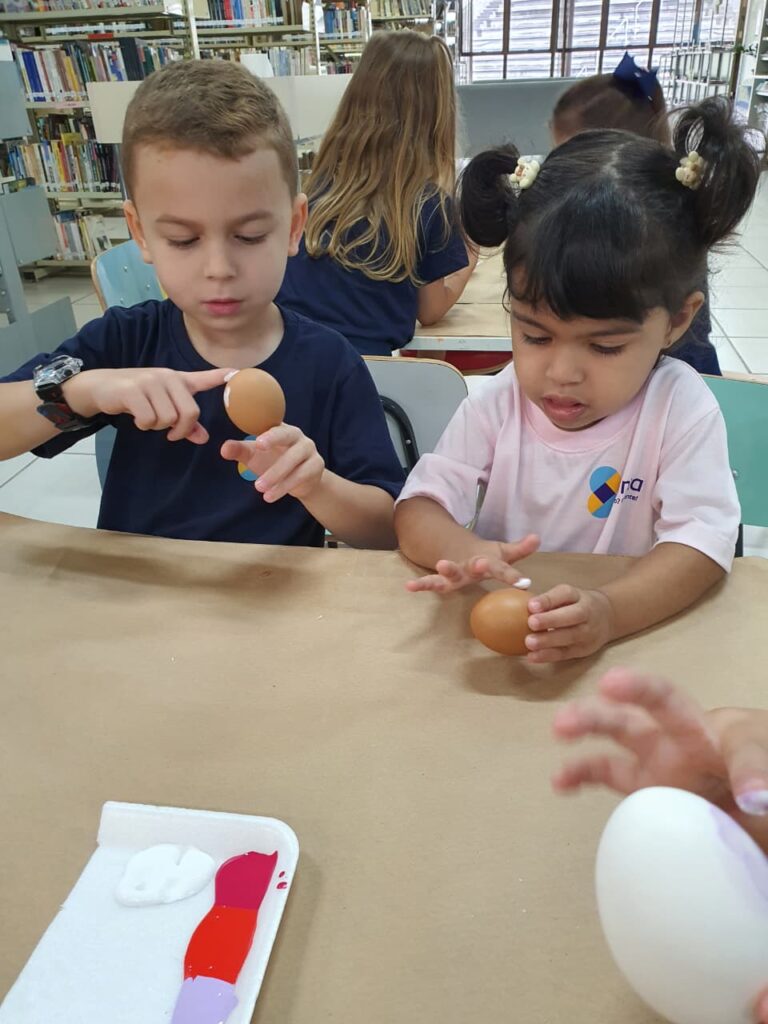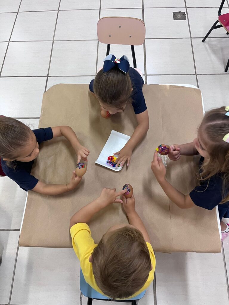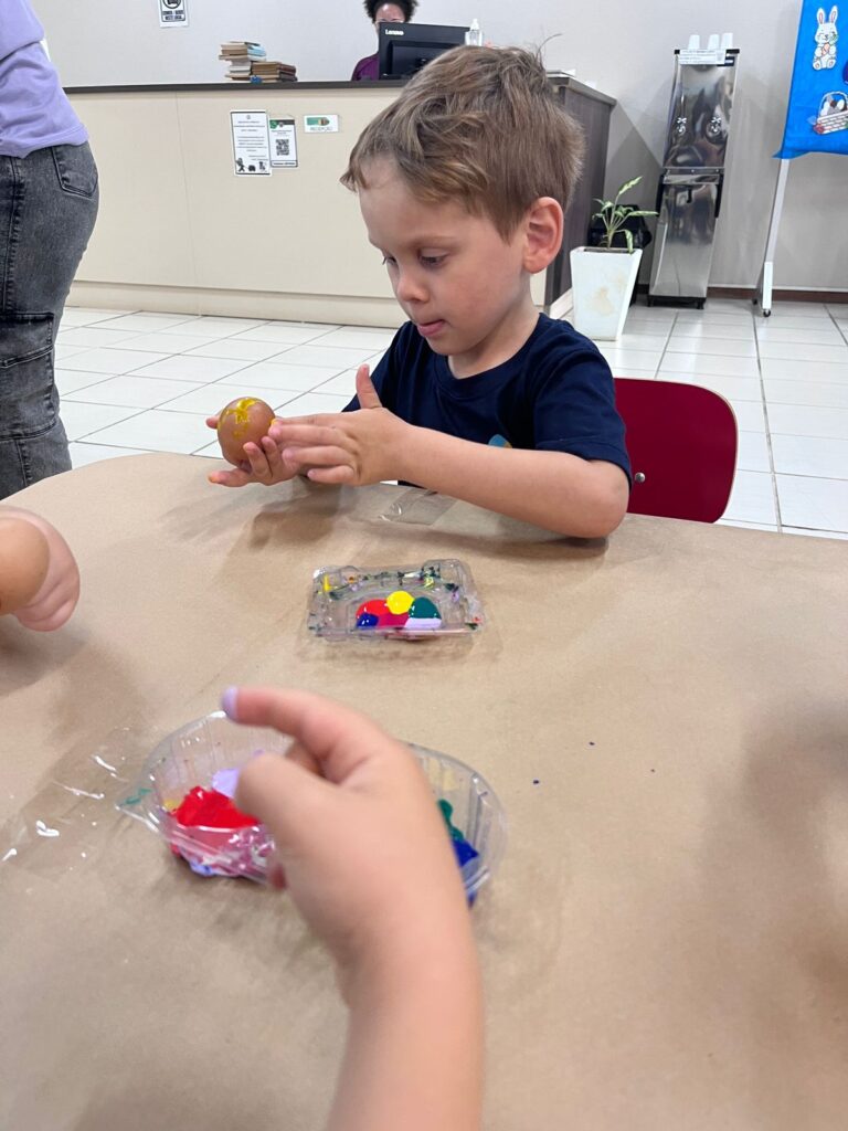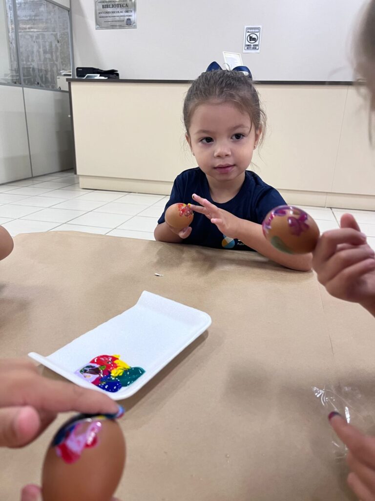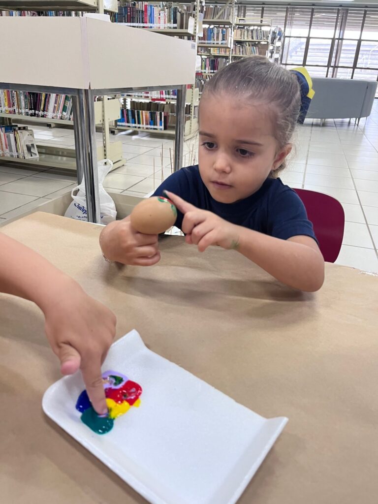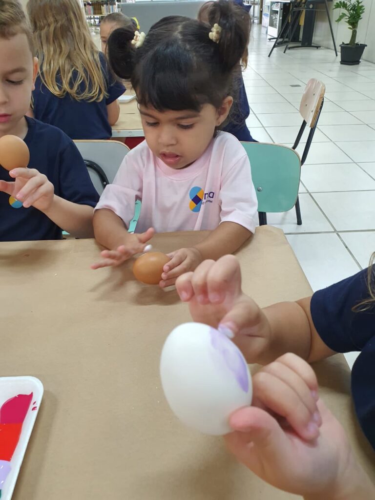 A história “O Coelhinho e o Pé de Cacau” despertou a imaginação e a curiosidade das crianças, trazendo muita magia e aprendizado. Após a história, os pequenos colocaram a criatividade em ação pintando casquinhas de ovos, explorando cores e texturas com muita alegria!! E para completar esse dia especial, a diversão continuou na brinquedoteca, com muitas brincadeiras, risadas e interação entre os colegas!