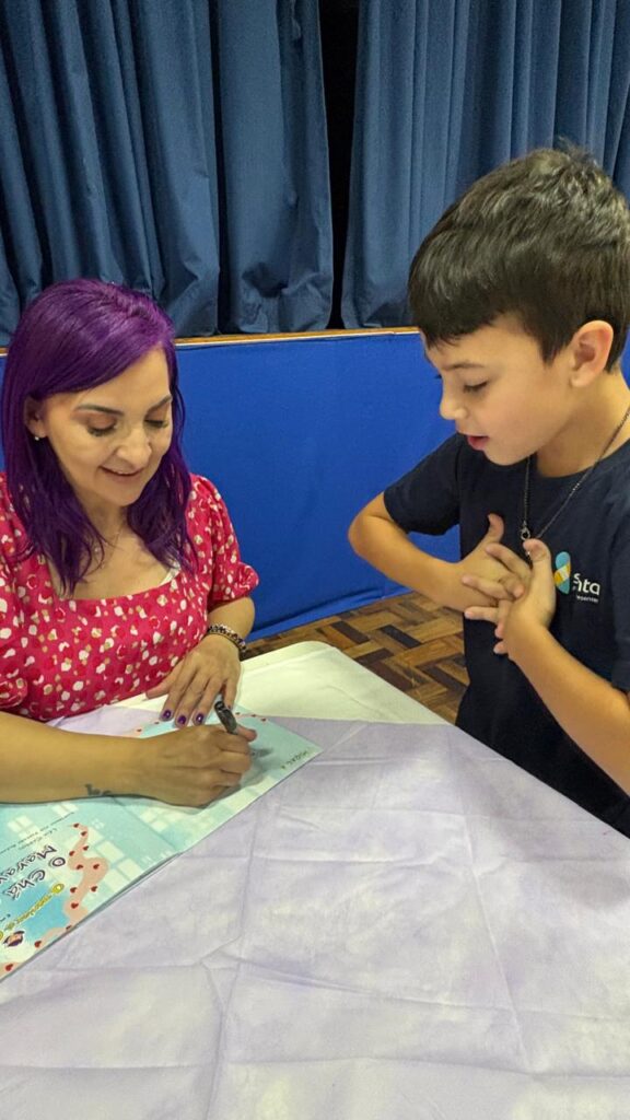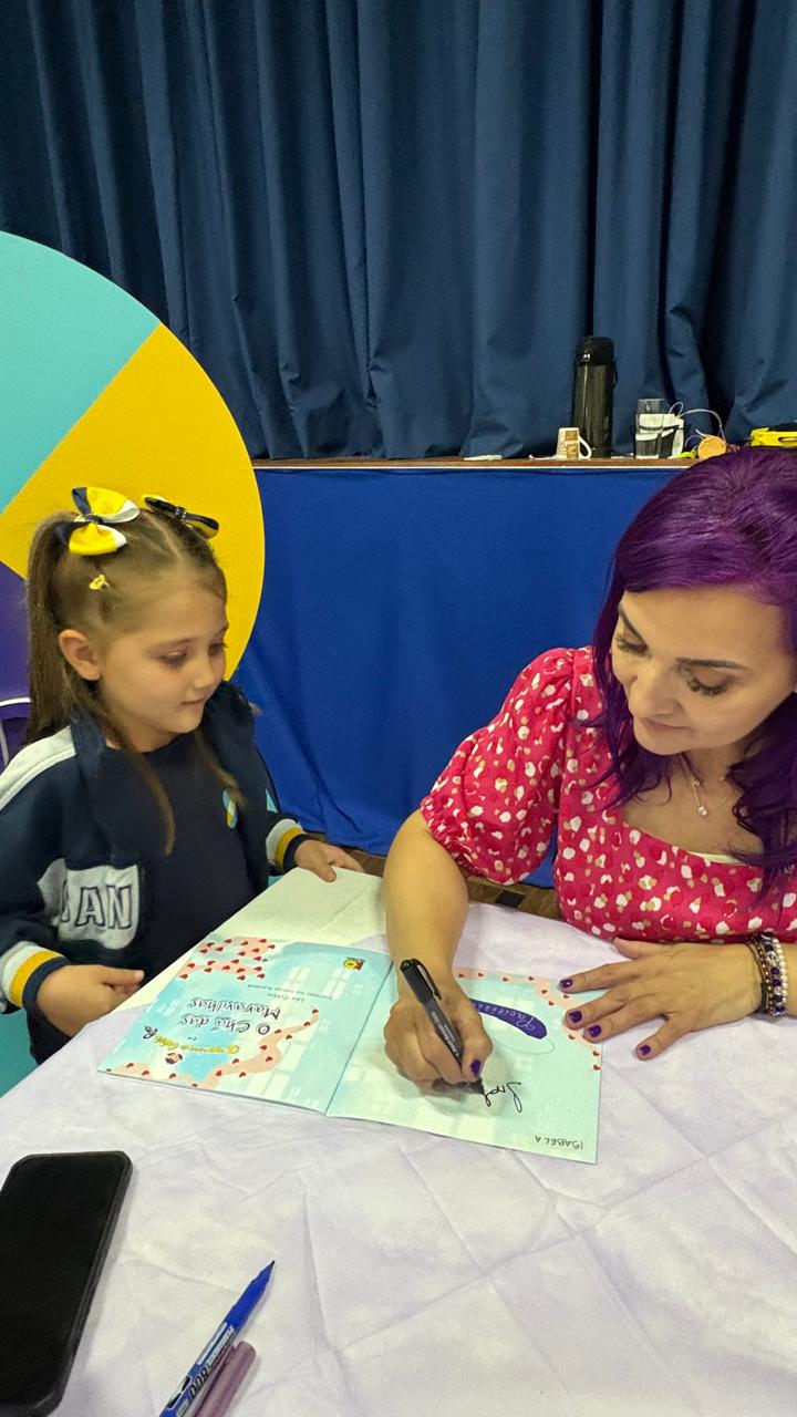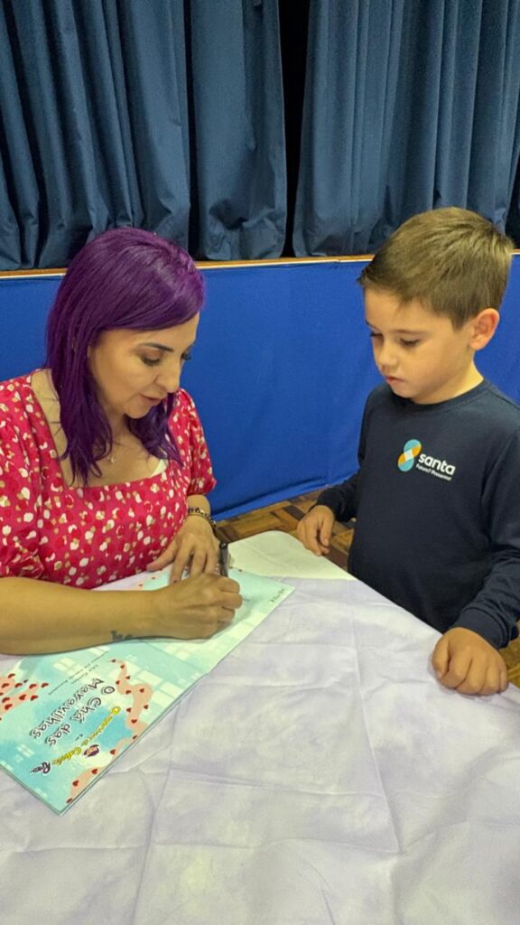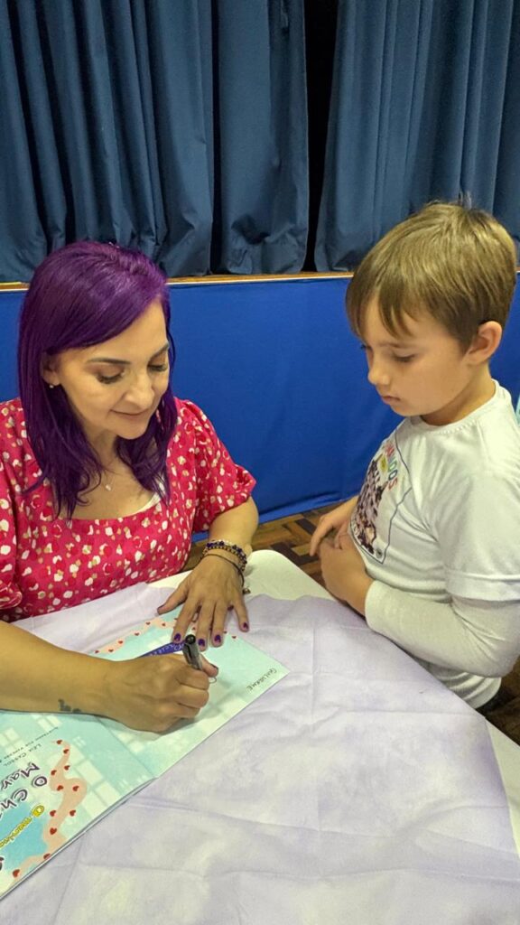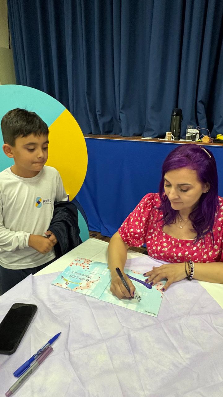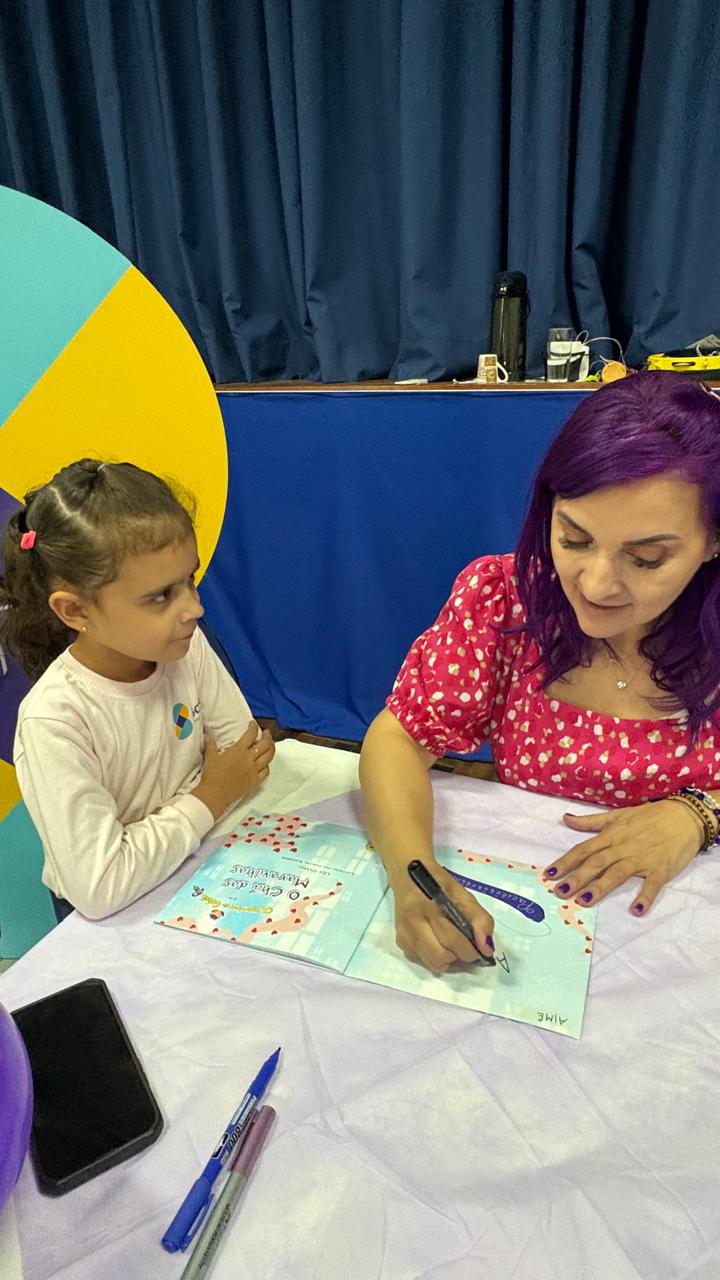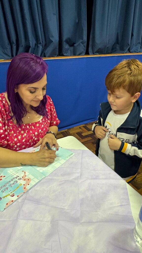 Com muita alegria e imaginação, participaram de uma envolvente hora do conto, conduzida pela própria autora, que trouxe suas histórias à vida de forma lúdica e divertida. Após a contação, os pequenos leitores ainda tiveram a oportunidade de viver o encantamento do momento de autógrafos, aproximando-se ainda mais do universo da leitura.