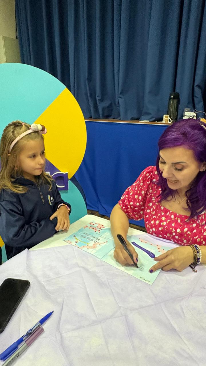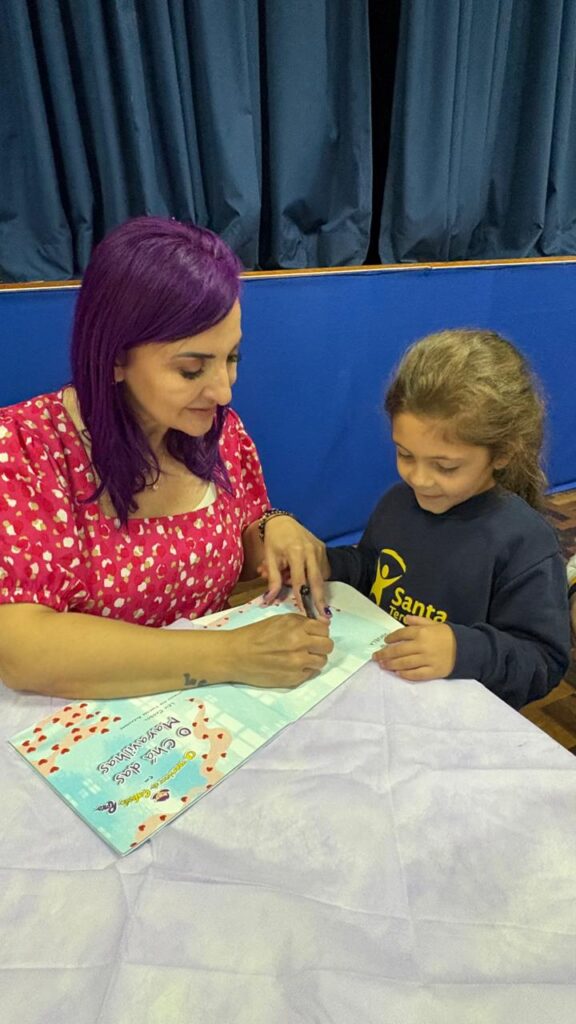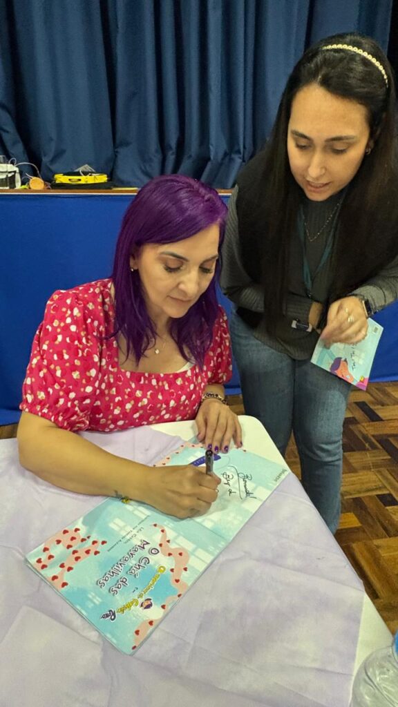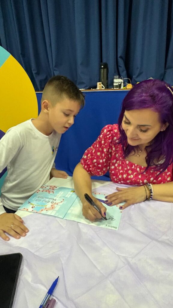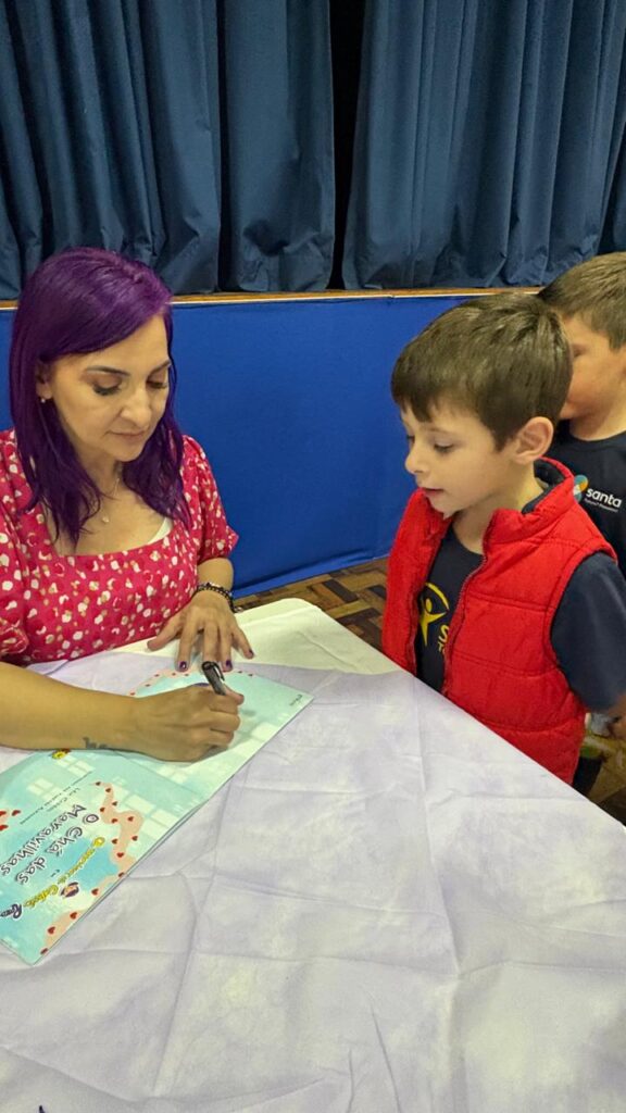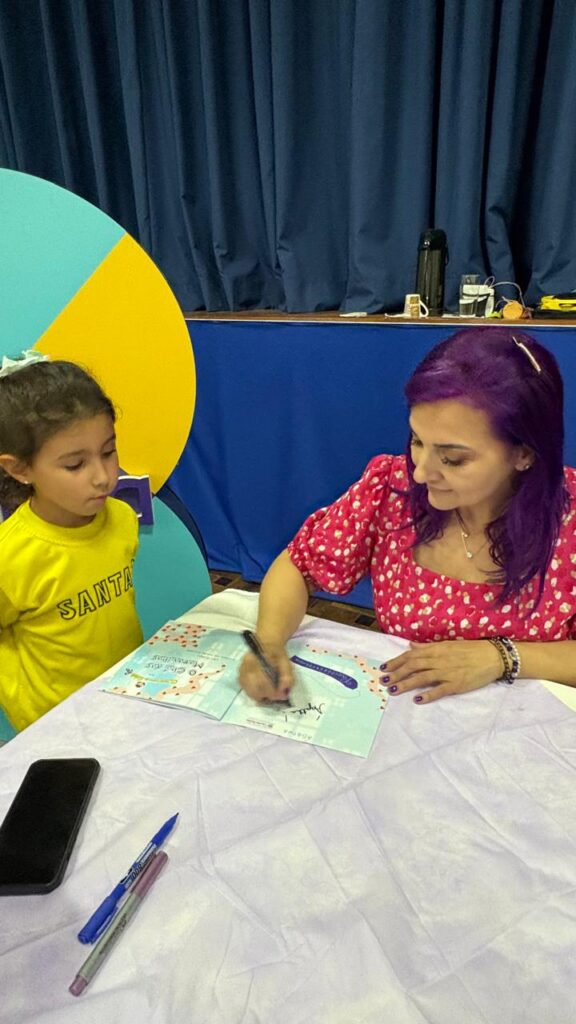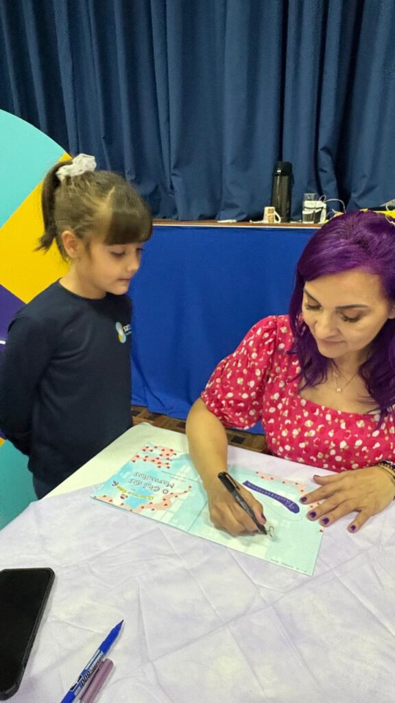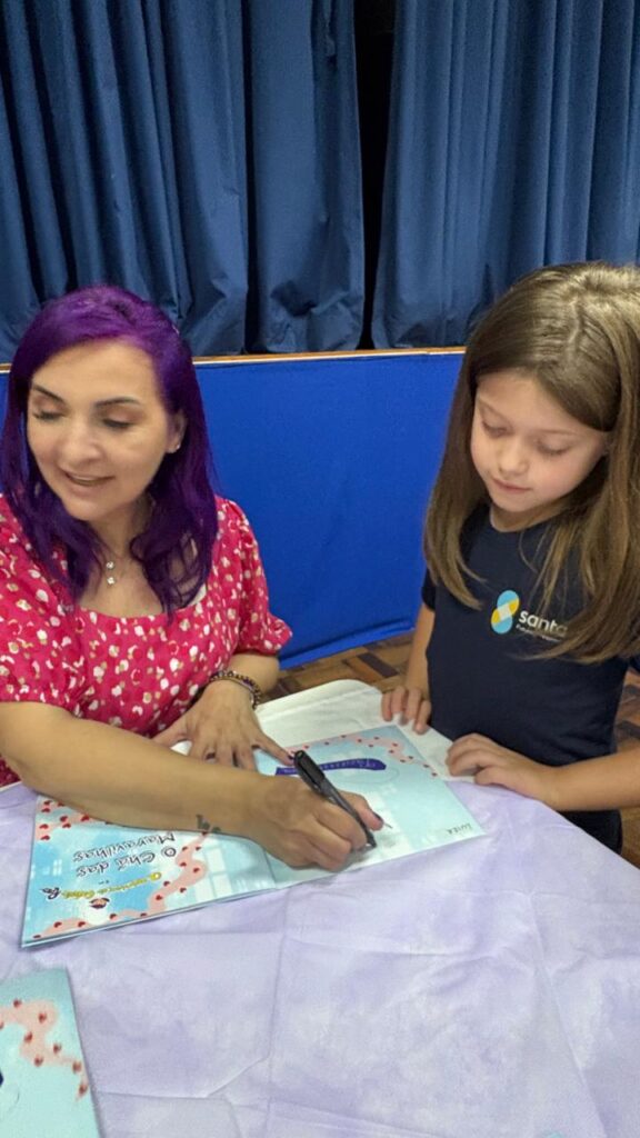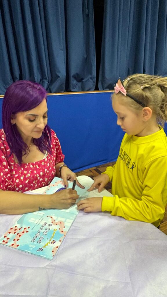 Com muita alegria e imaginação, participaram de uma envolvente hora do conto, conduzida pela própria autora, que trouxe suas histórias à vida de forma lúdica e divertida. Após a contação, os pequenos leitores ainda tiveram a oportunidade de viver o encantamento do momento de autógrafos, aproximando-se ainda mais do universo da leitura.