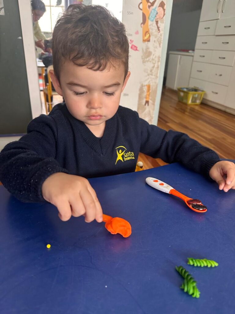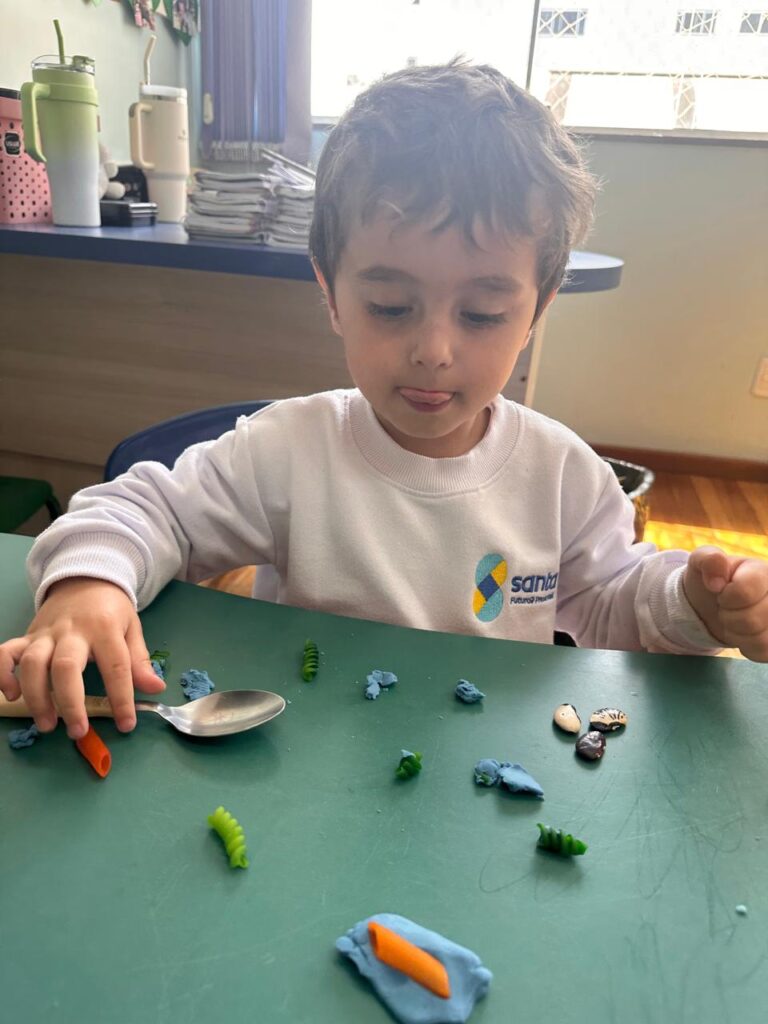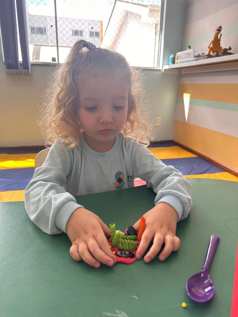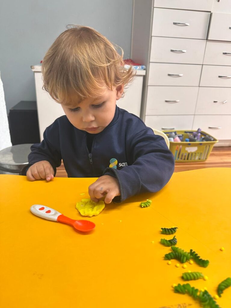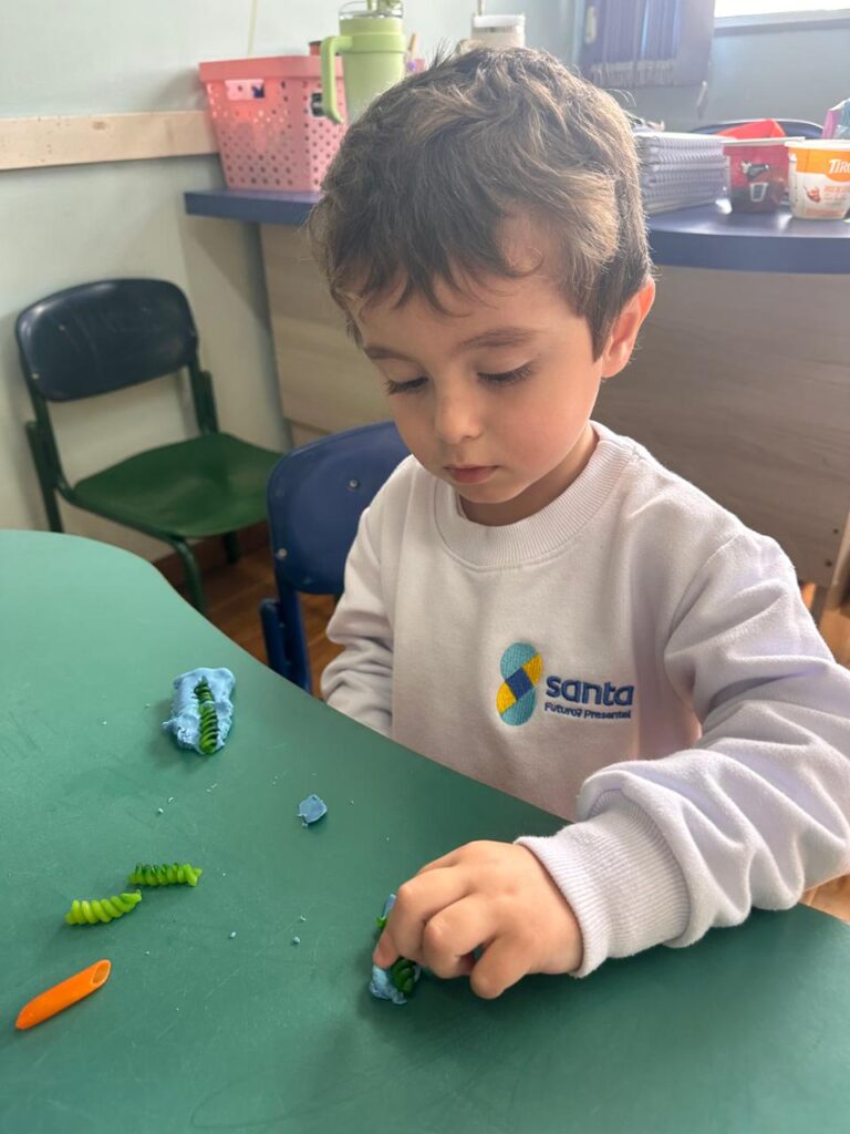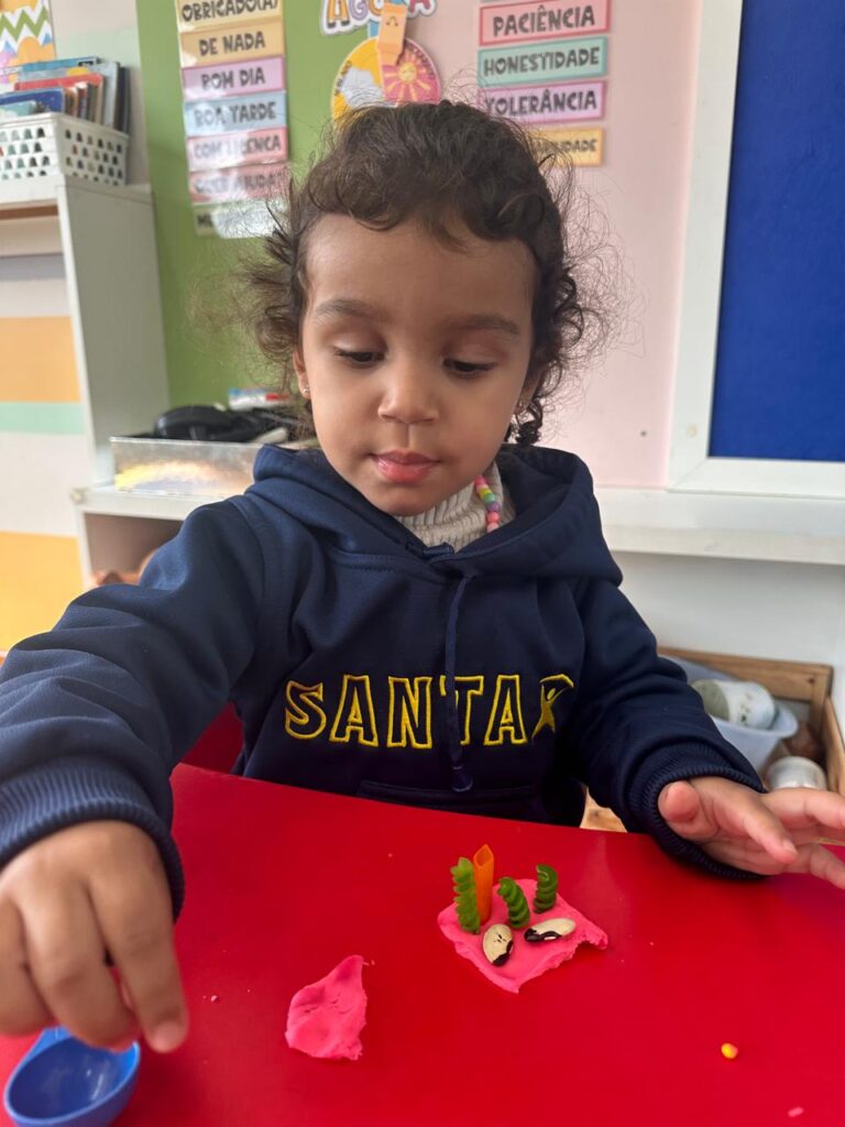Mãos que amassam e criamMassinha que vira diversãoSementes que enfeitam o brincarTexturas para imaginarExplorando com curiosidadeAprendendo com criatividade!