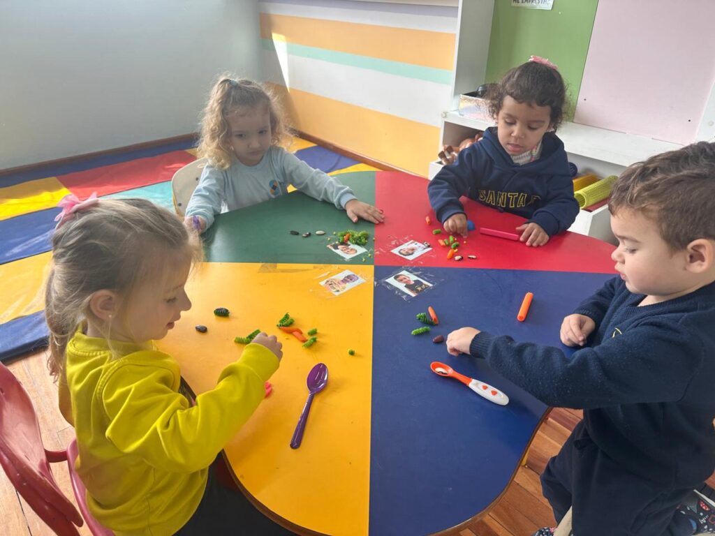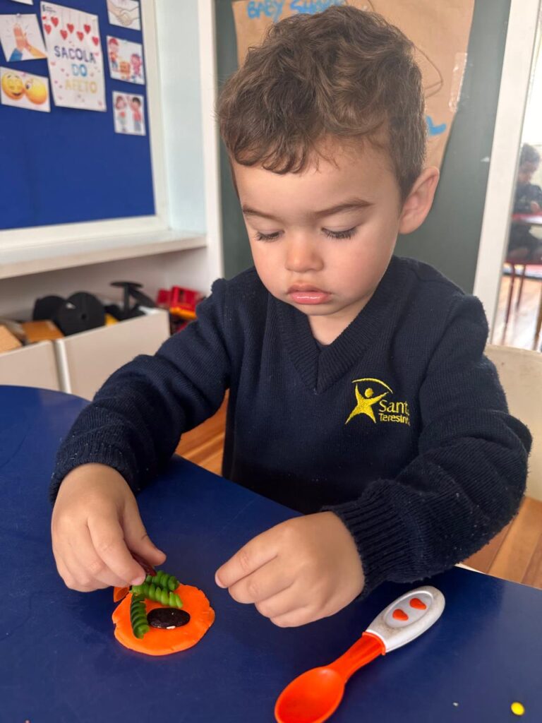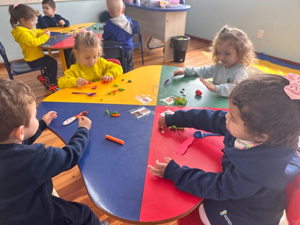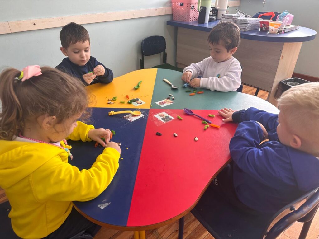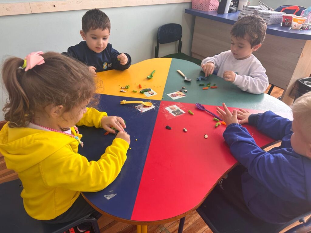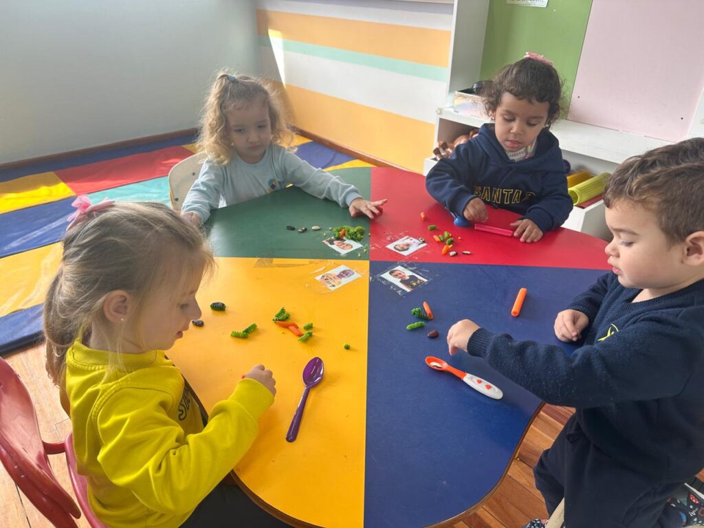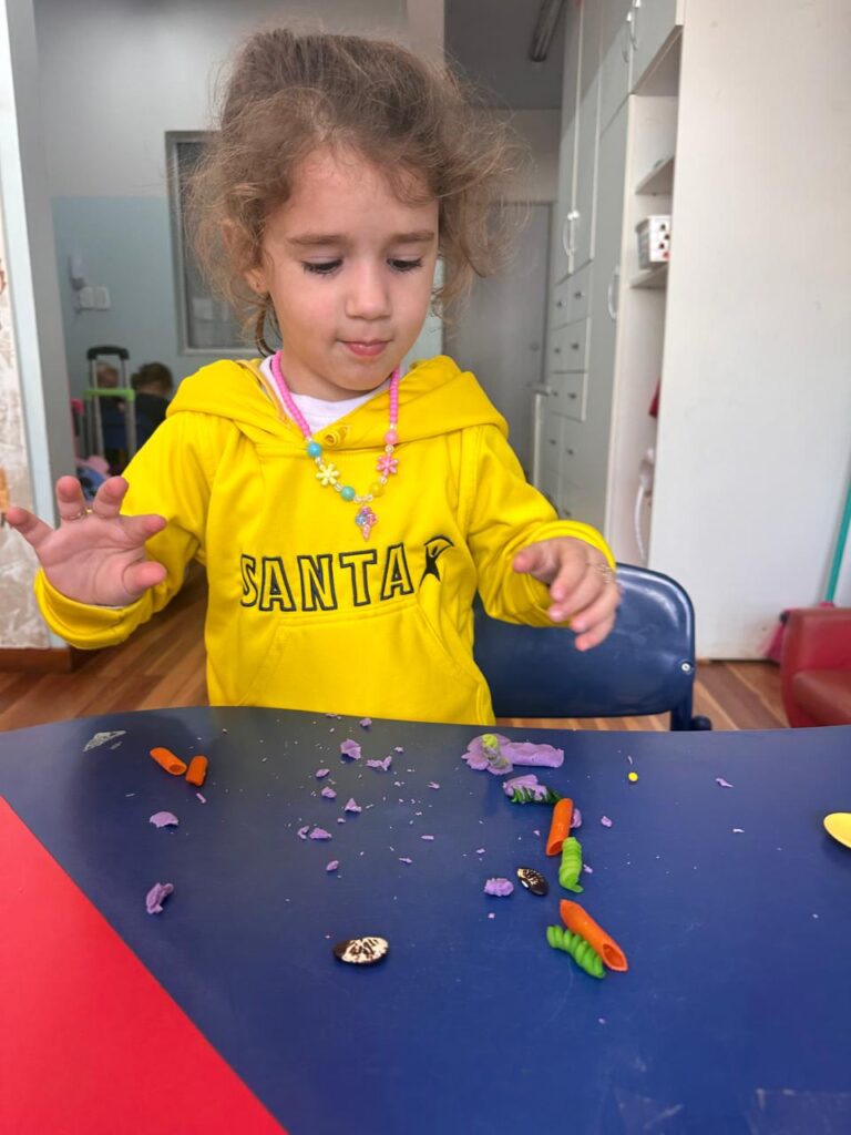 Mãos que amassam e criamMassinha que vira diversãoSementes que enfeitam o brincarTexturas para imaginarExplorando com curiosidadeAprendendo com criatividade!