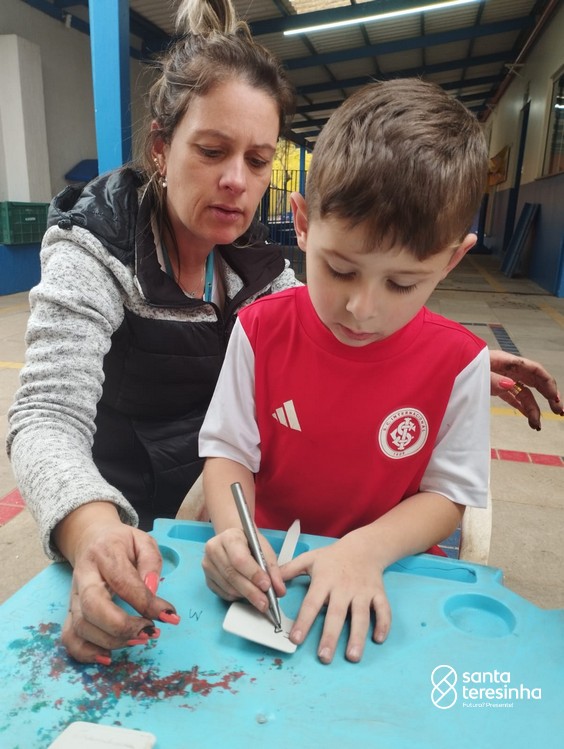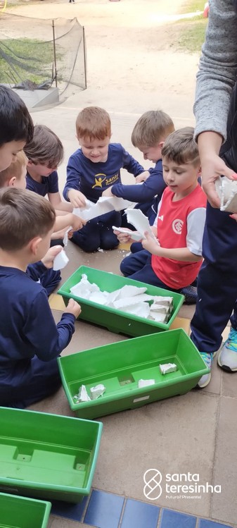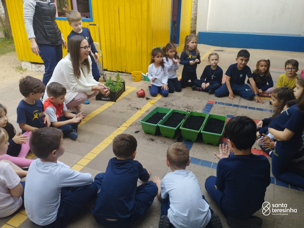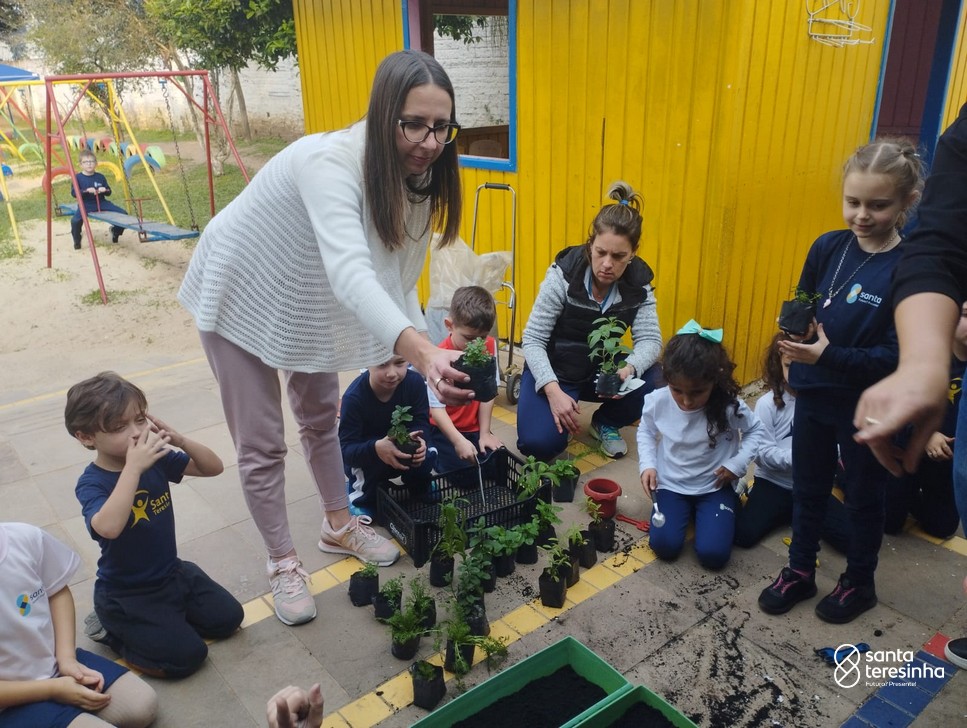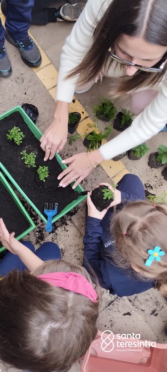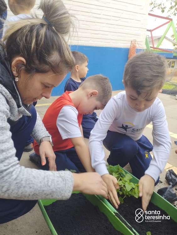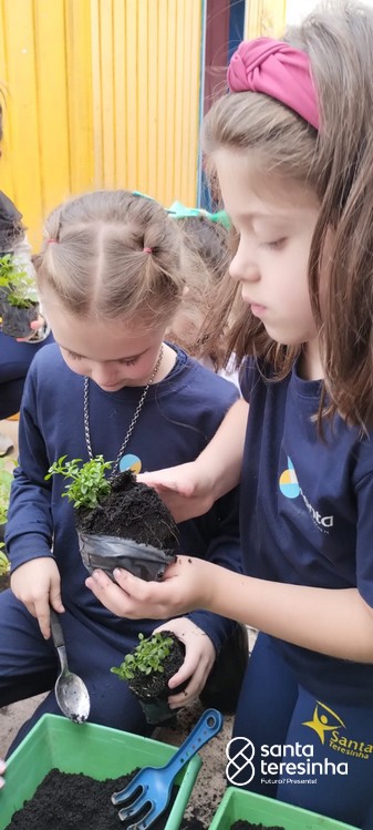 As mães Andressa e Ana Paula, dos amigos Rafael e Otávio, realizaram com a turma o plantio de chás.