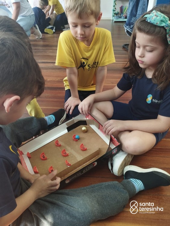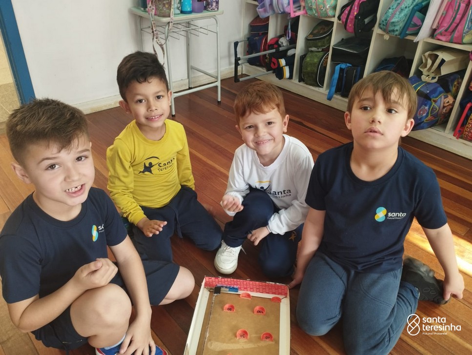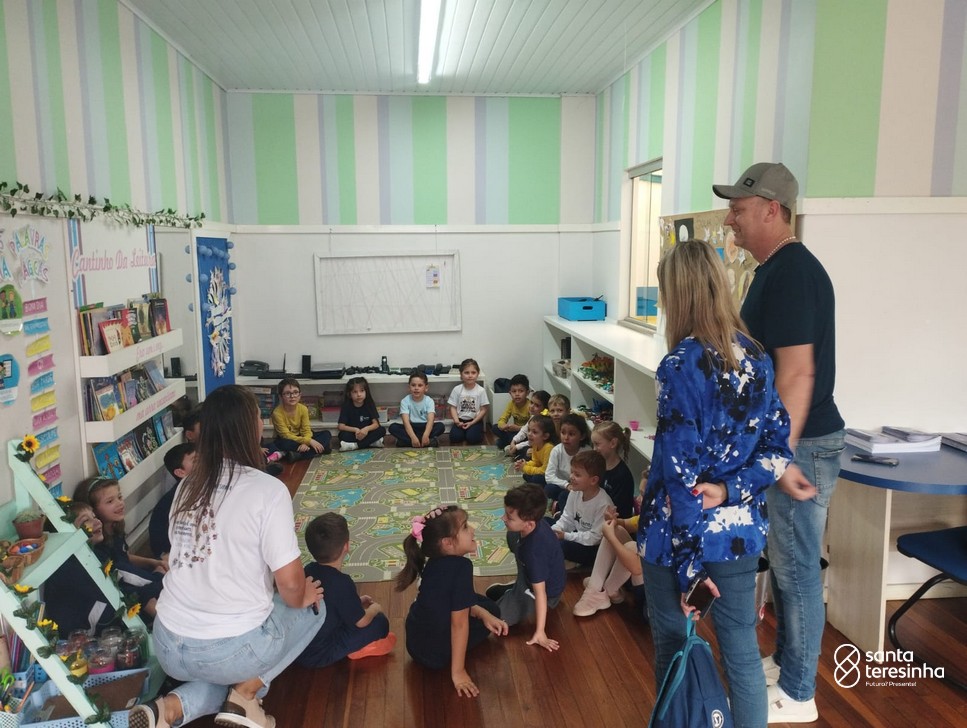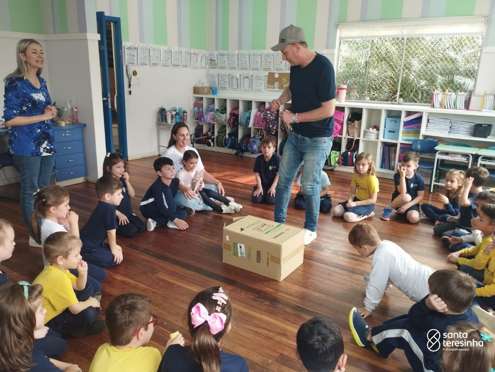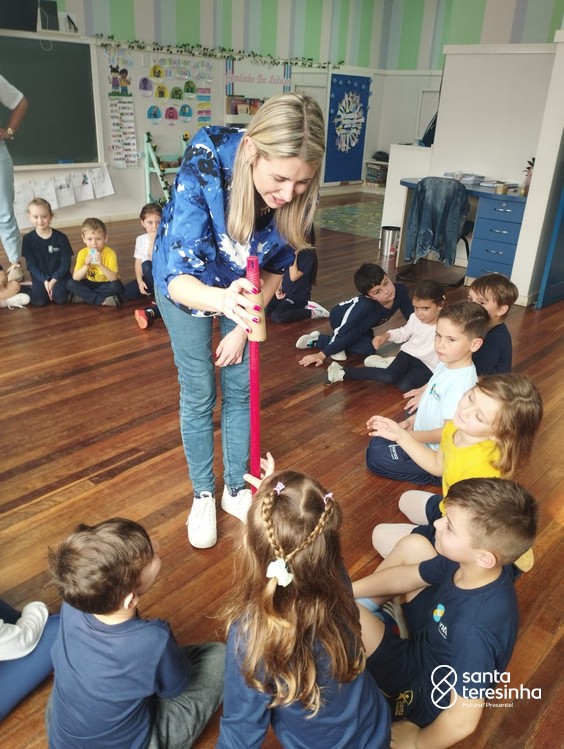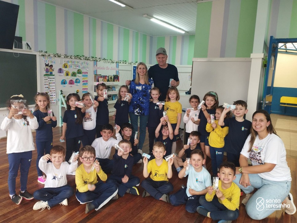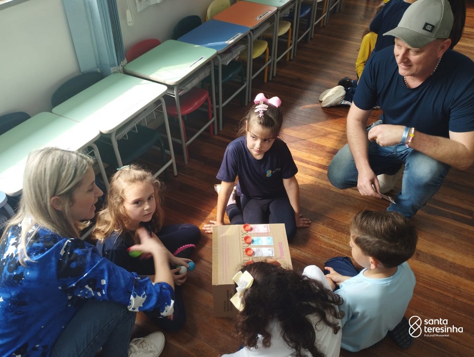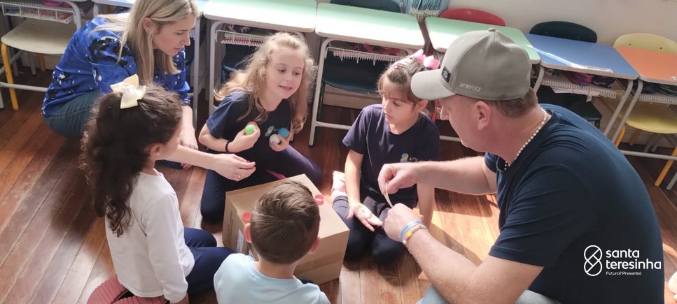 Adri e Luciano, pais das amigas Laura e Lívia, compartilharam com a turma seus talentos! A família criou diversos brinquedos utilizando materiais recicláveis e trouxe para apresentar à turma.