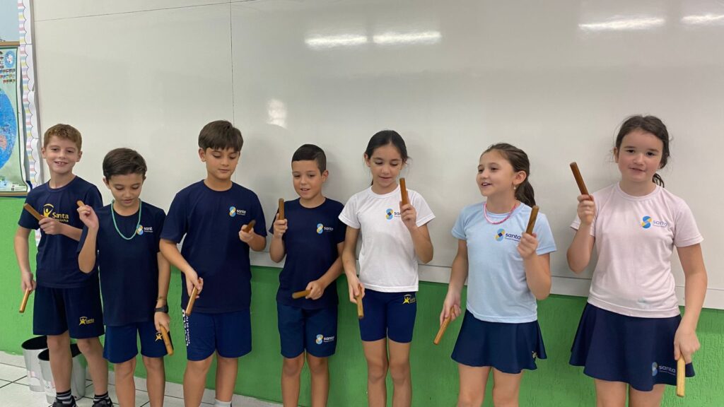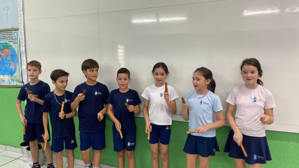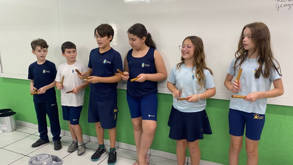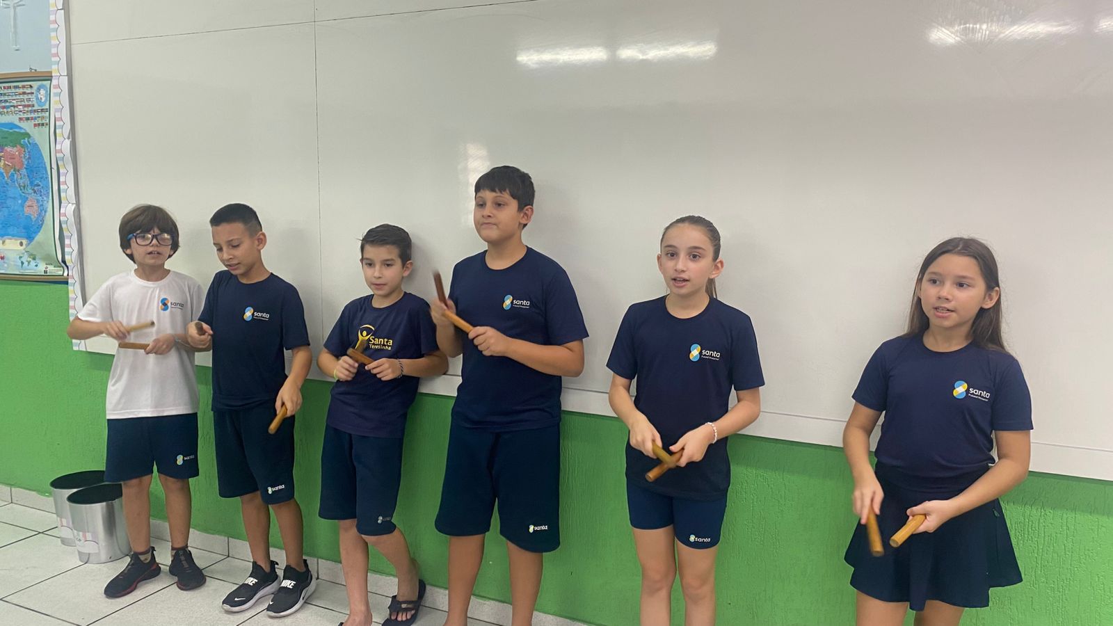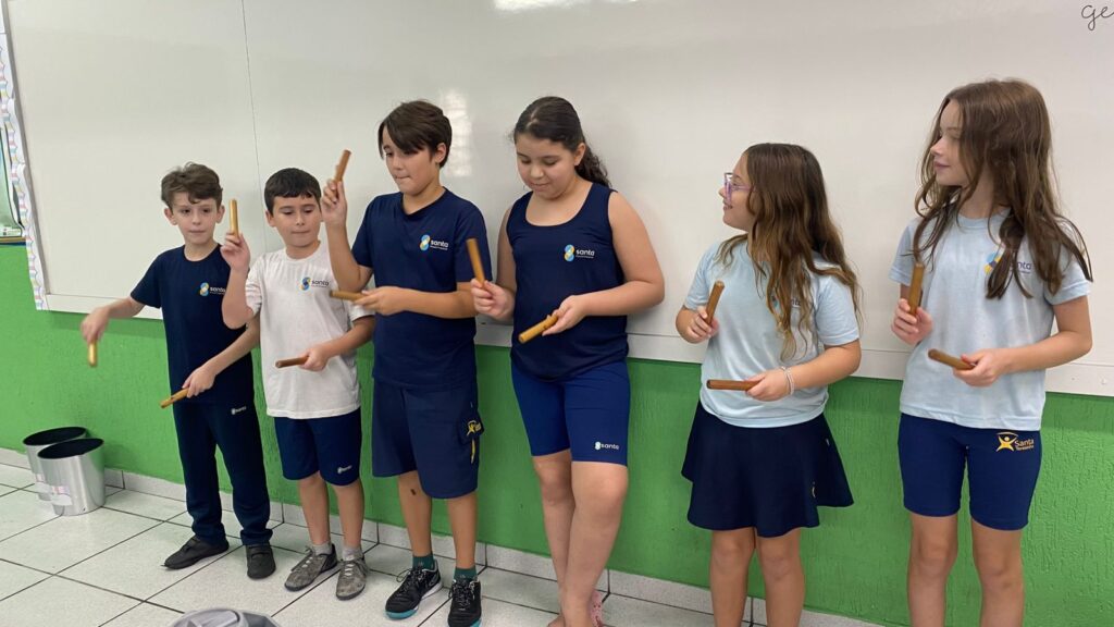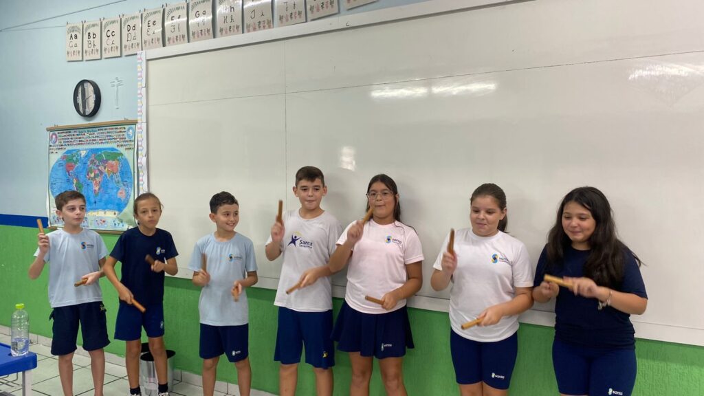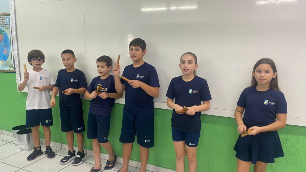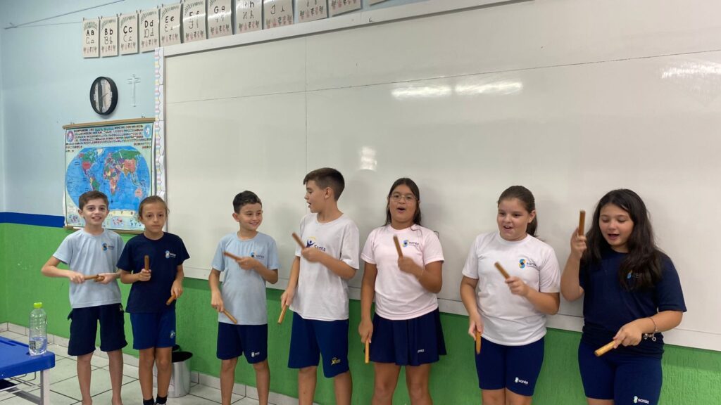 Na aula de Música, a turma do 4º ano B explorou diferentes ritmos utilizando o instrumento clavas. A atividade estimulou a percepção rítmica, a coordenação motora e a atenção dos alunos, que acompanharam batidas e sequências sonoras de forma coletiva. Além de aprender sobre os elementos da música, os estudantes vivenciaram um momento de expressão, concentração e trabalho em grupo através do ri