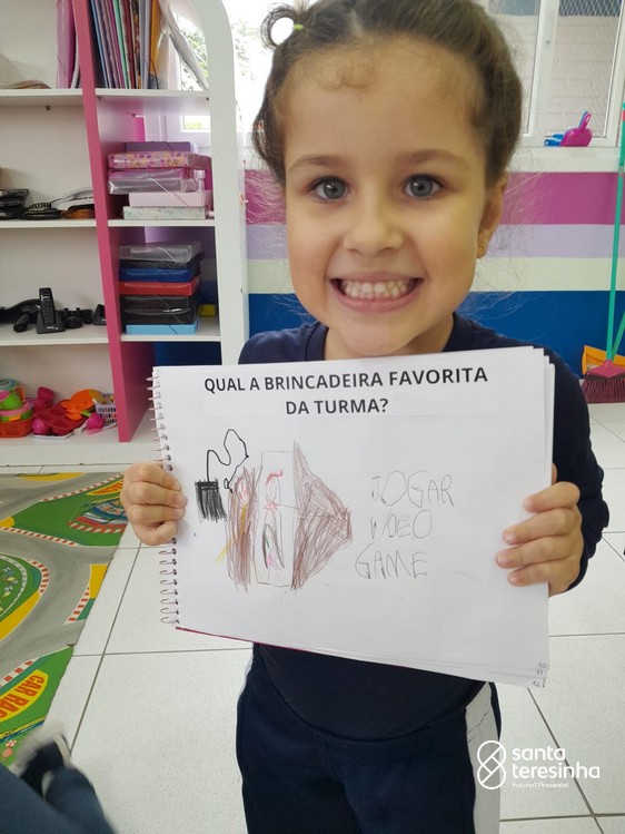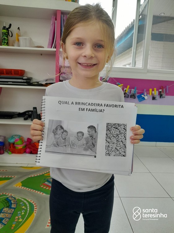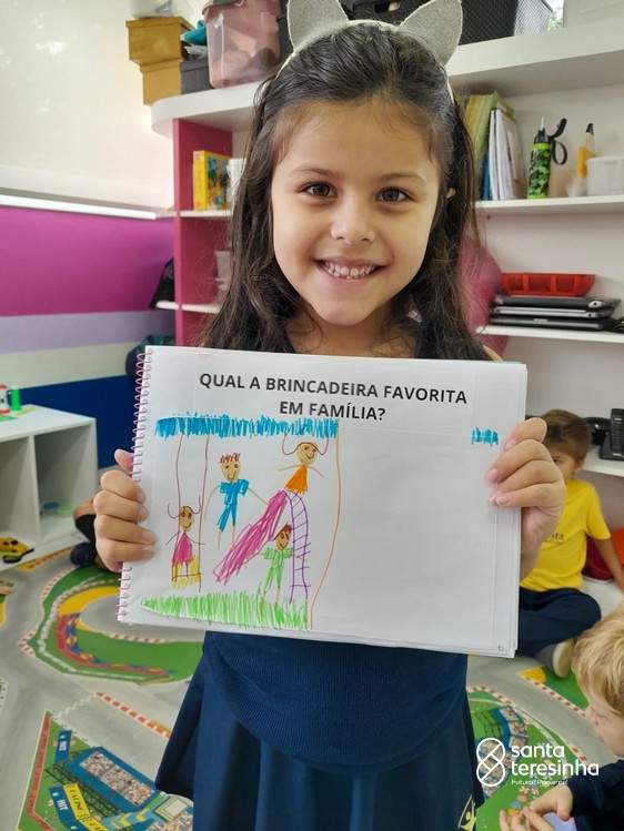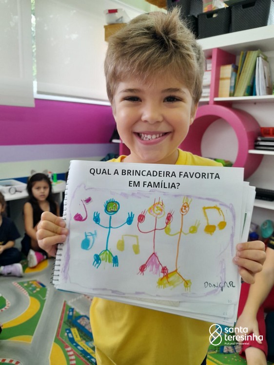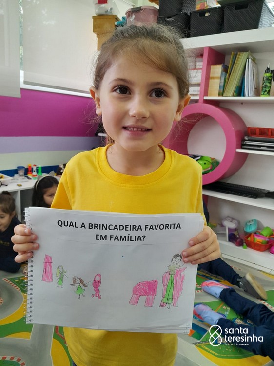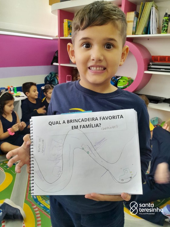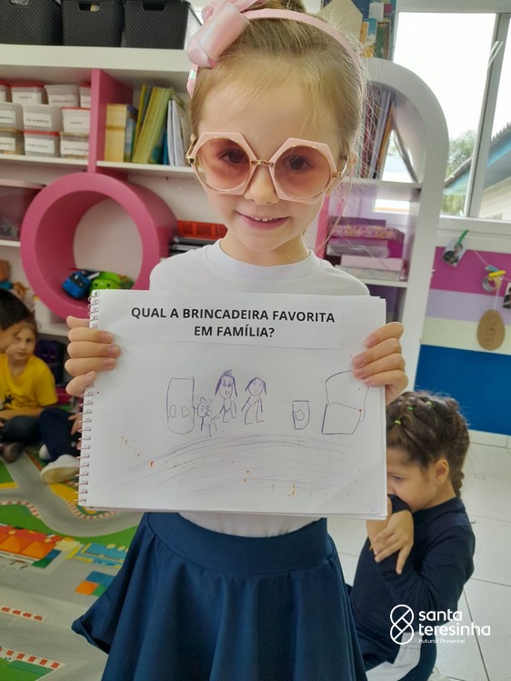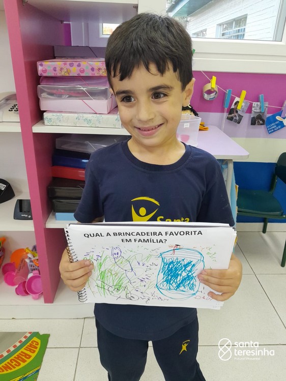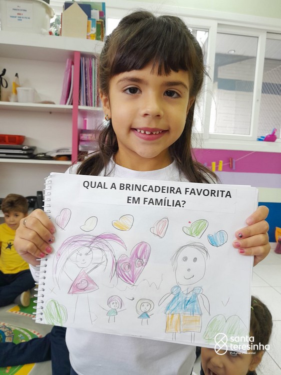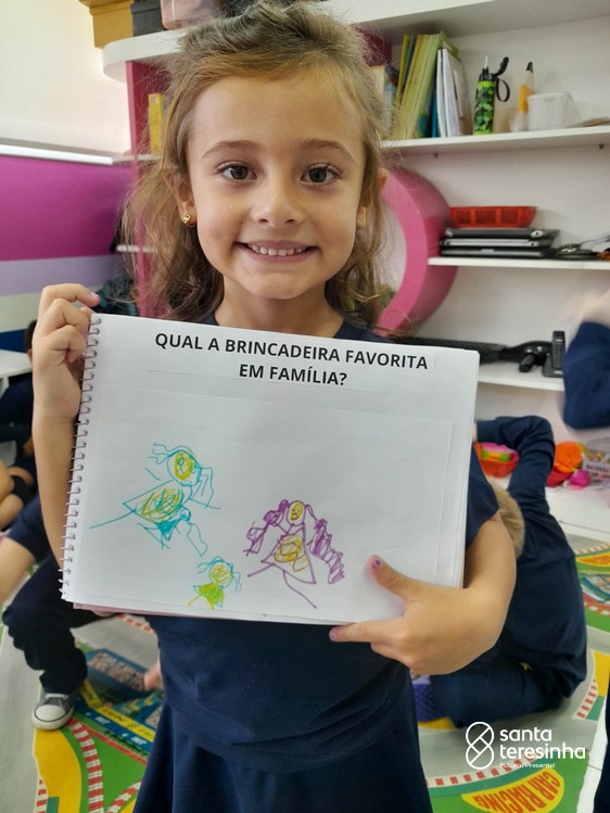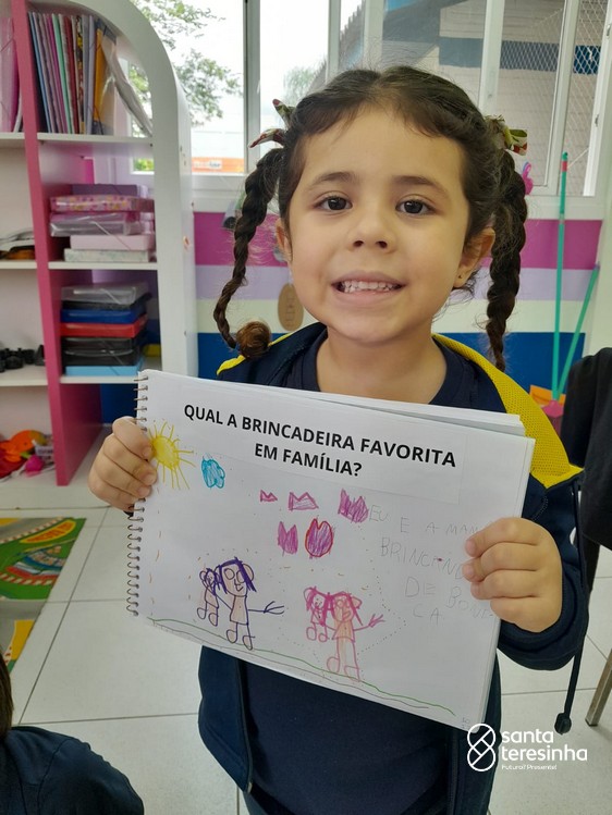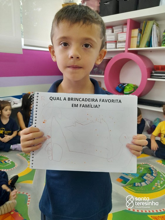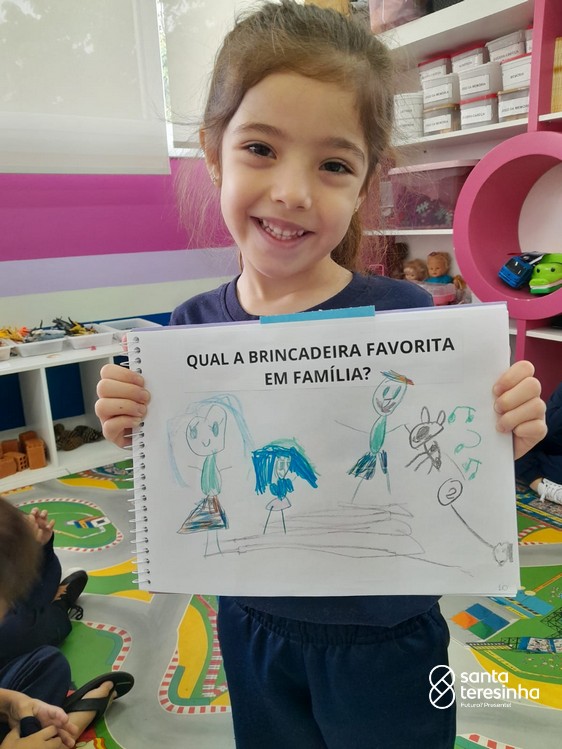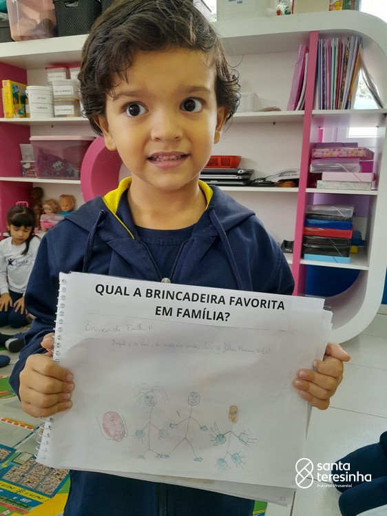 Nessa proposta, as crianças levaram o caderno de percurso para a exploração e realização do tema. Uma das tarefas era registrar qual a brincadeira favorita feita em família! Surgiram brincadeiras muito divertidas!!!