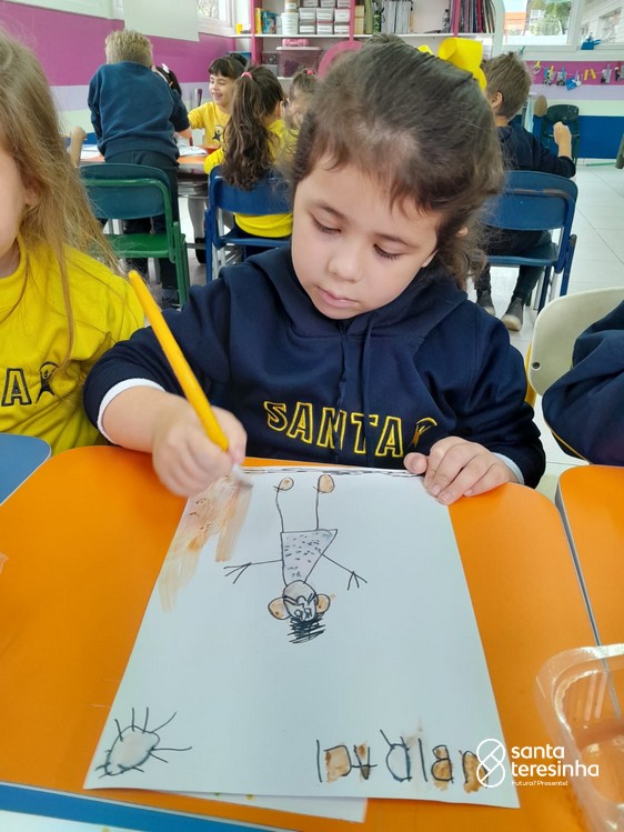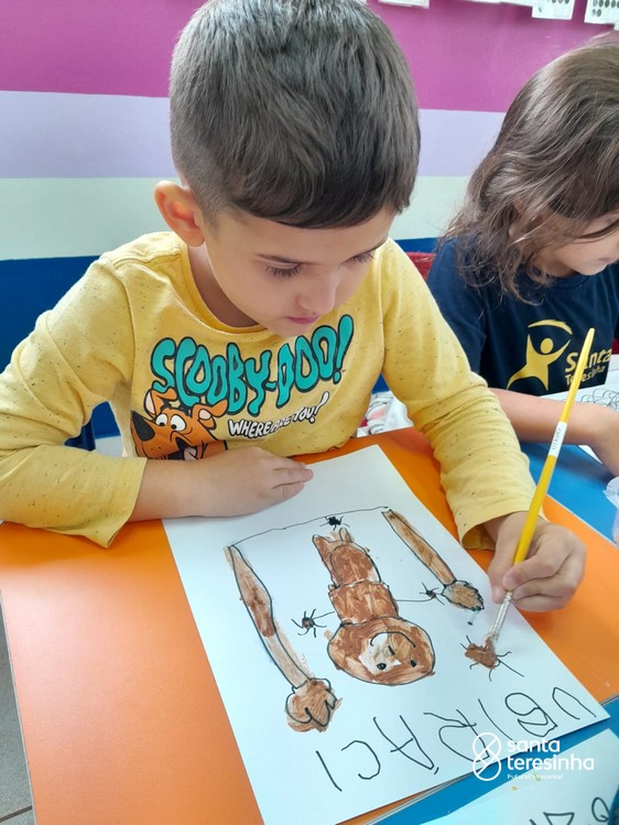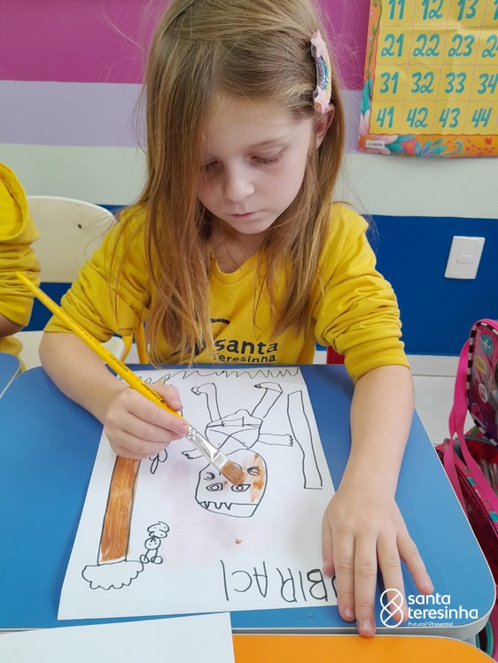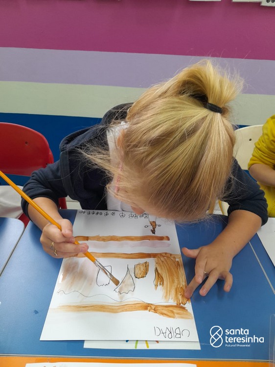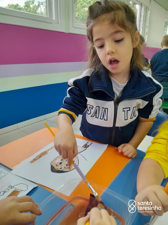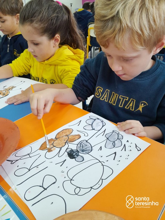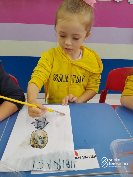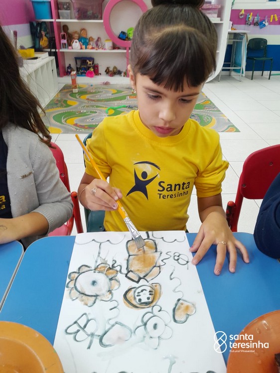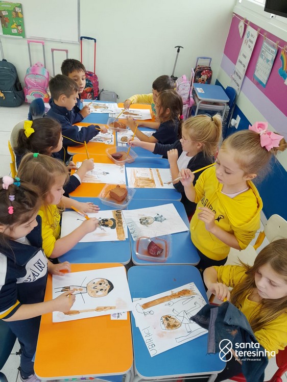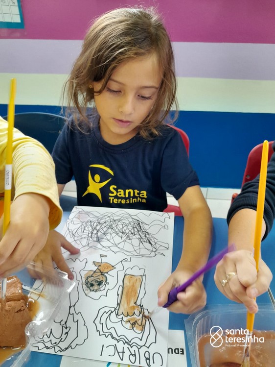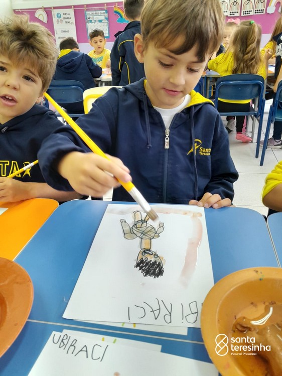 Experimentamos a tinta natural, que é usada pelo povo indígena. Nessa proposta, usamos argila e beterraba.