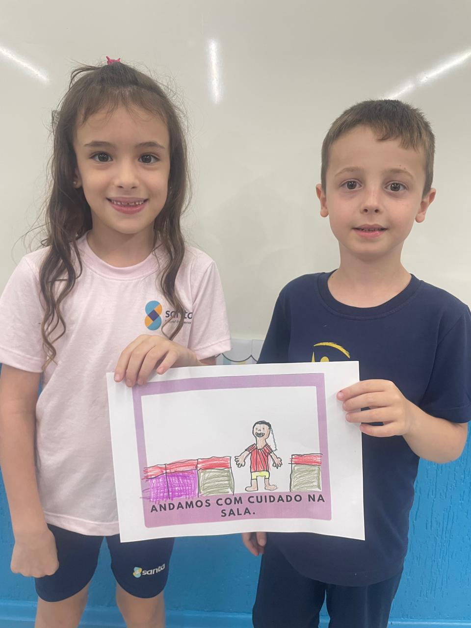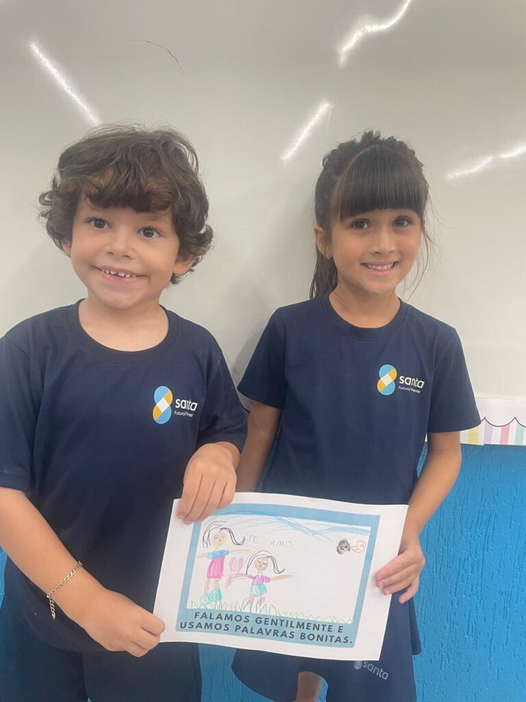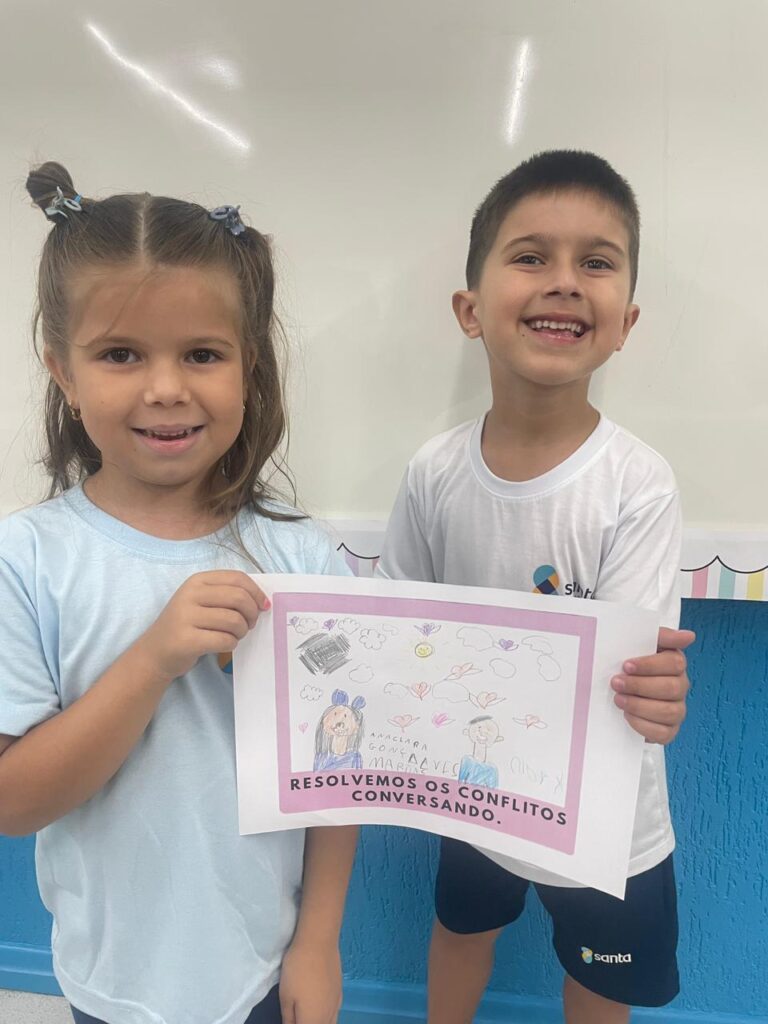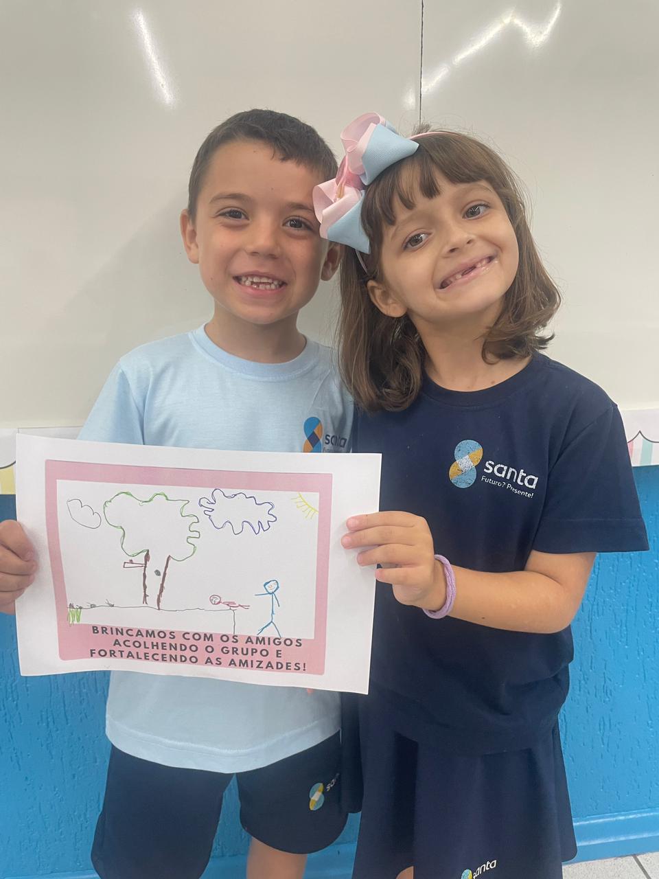 Como parte da proposta, após o momento de conversação realizaram o registro em desenho e participaram de uma brincadeira em duplas. Atividades que potencializaram o fortalecimento dos vínculos afetivos entre as crianças.