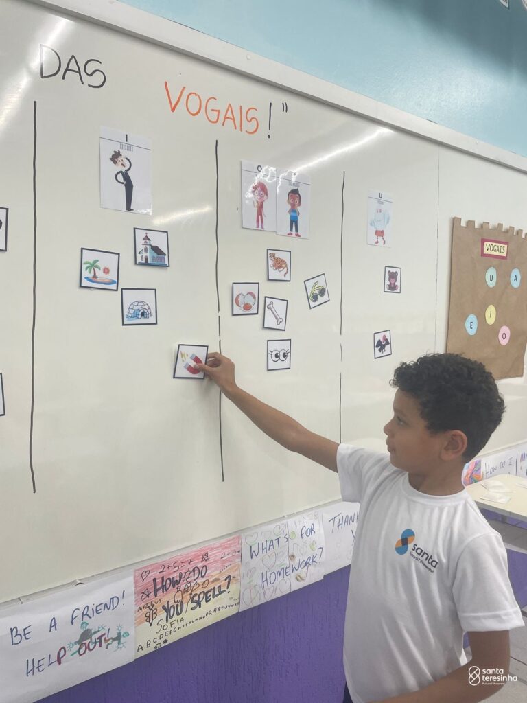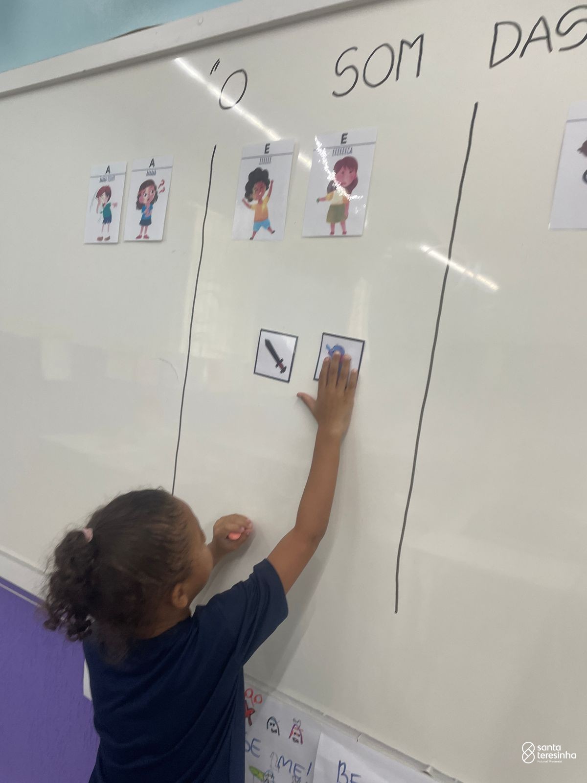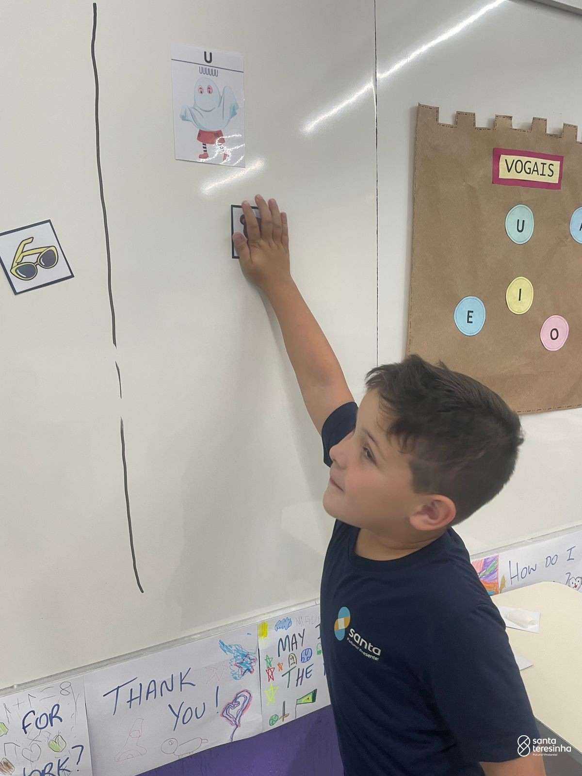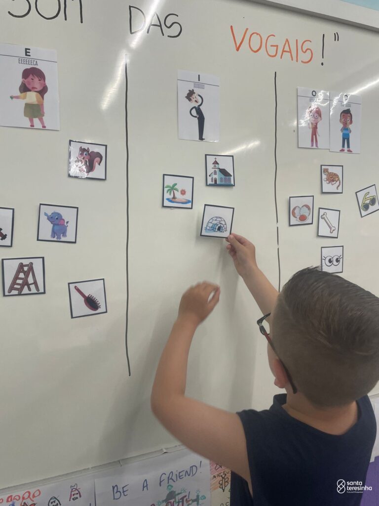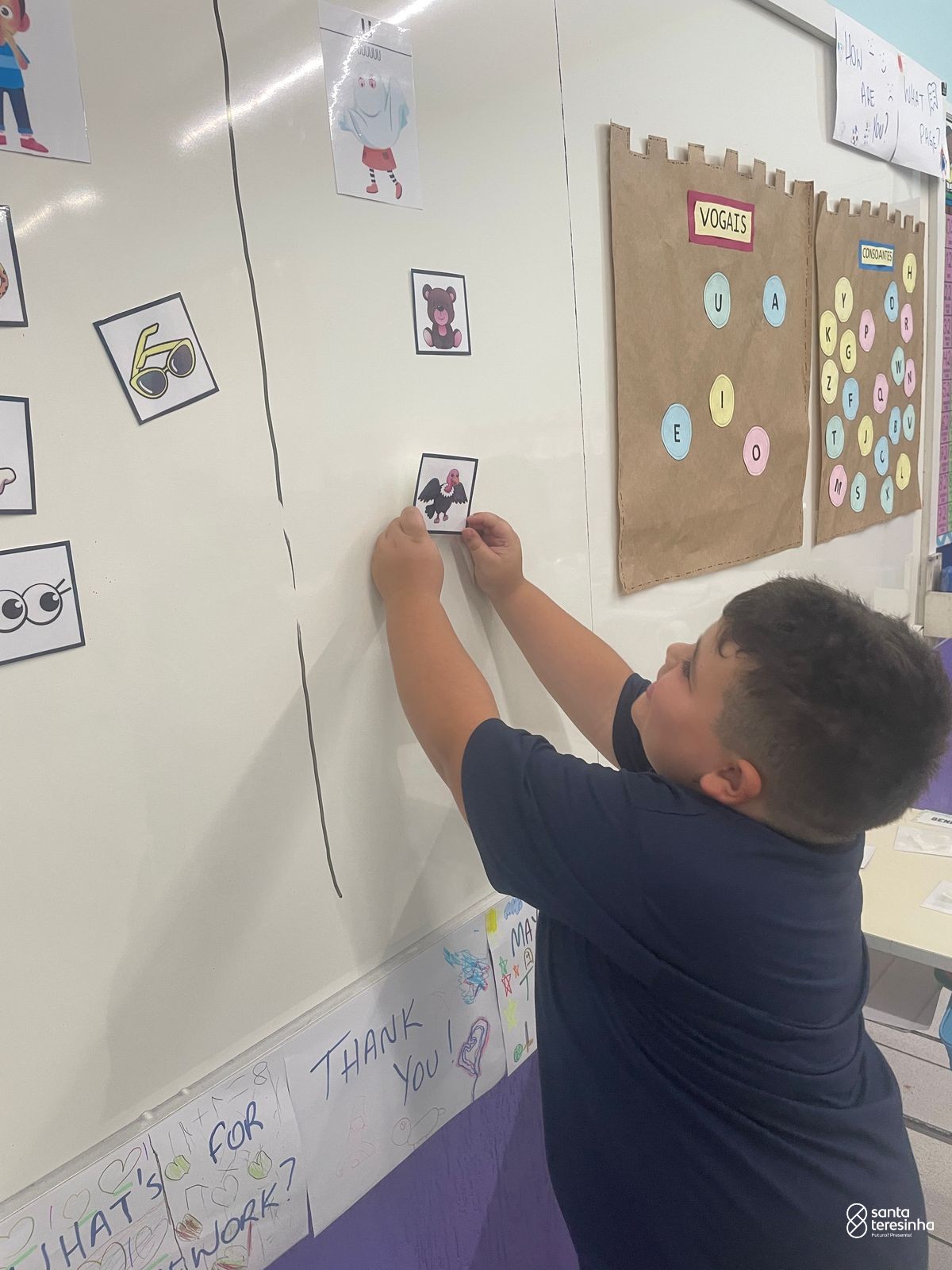 De forma lúdica e divertida a turma do 1° ano B, explorou o som das VOGAIS, através de brincadeira coletiva no quadro!
