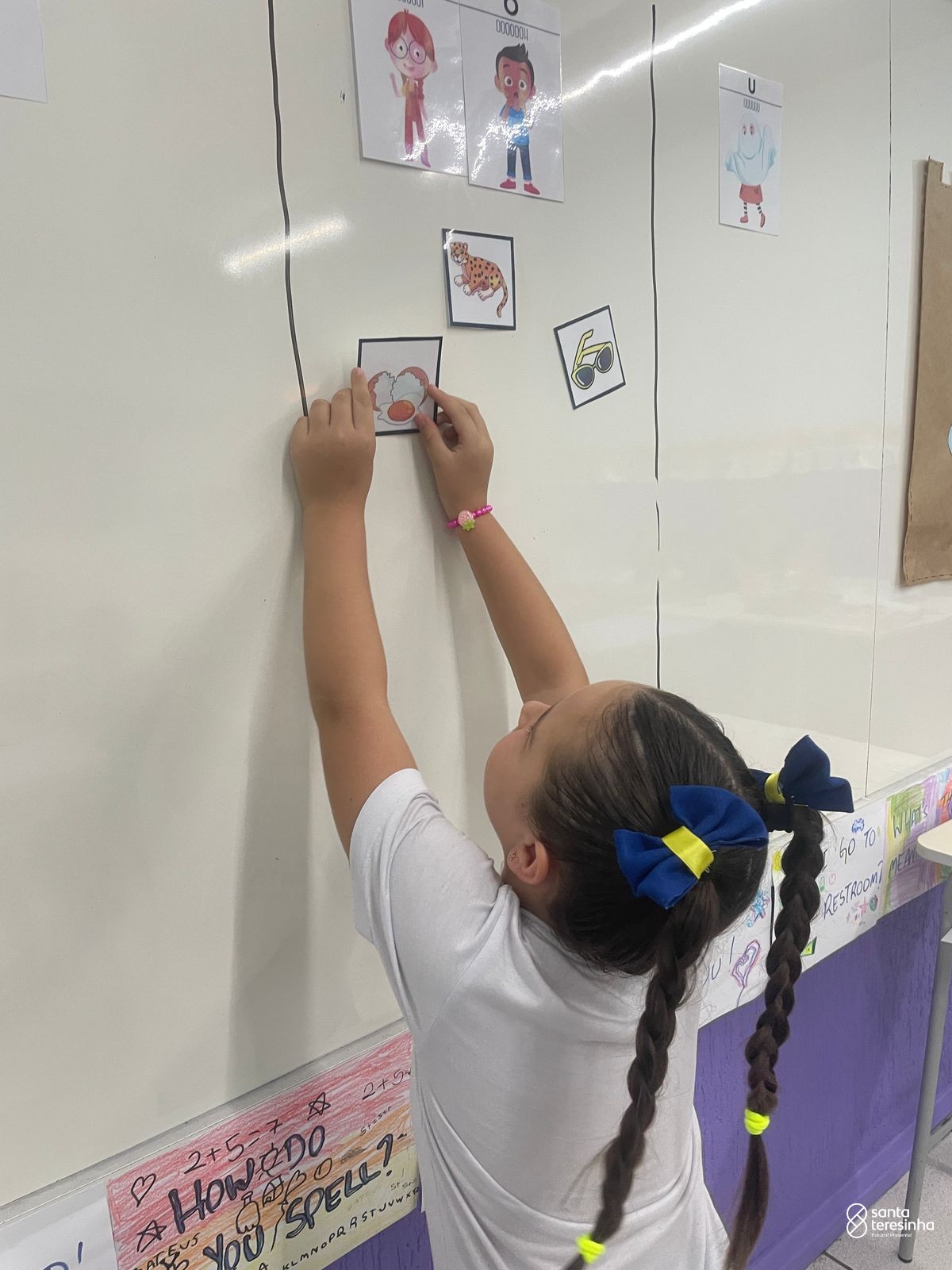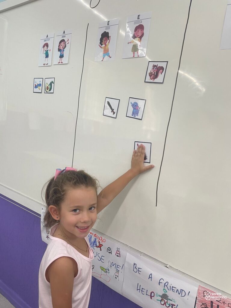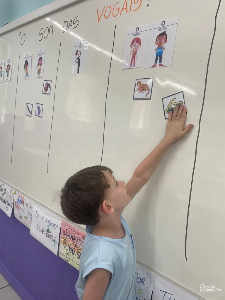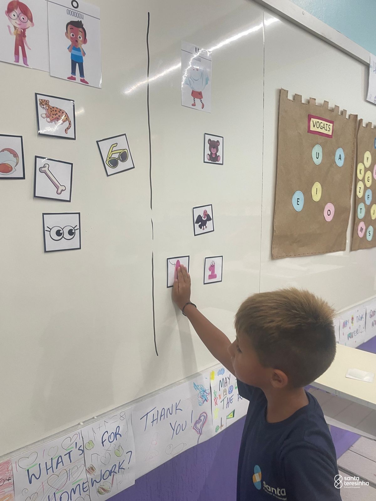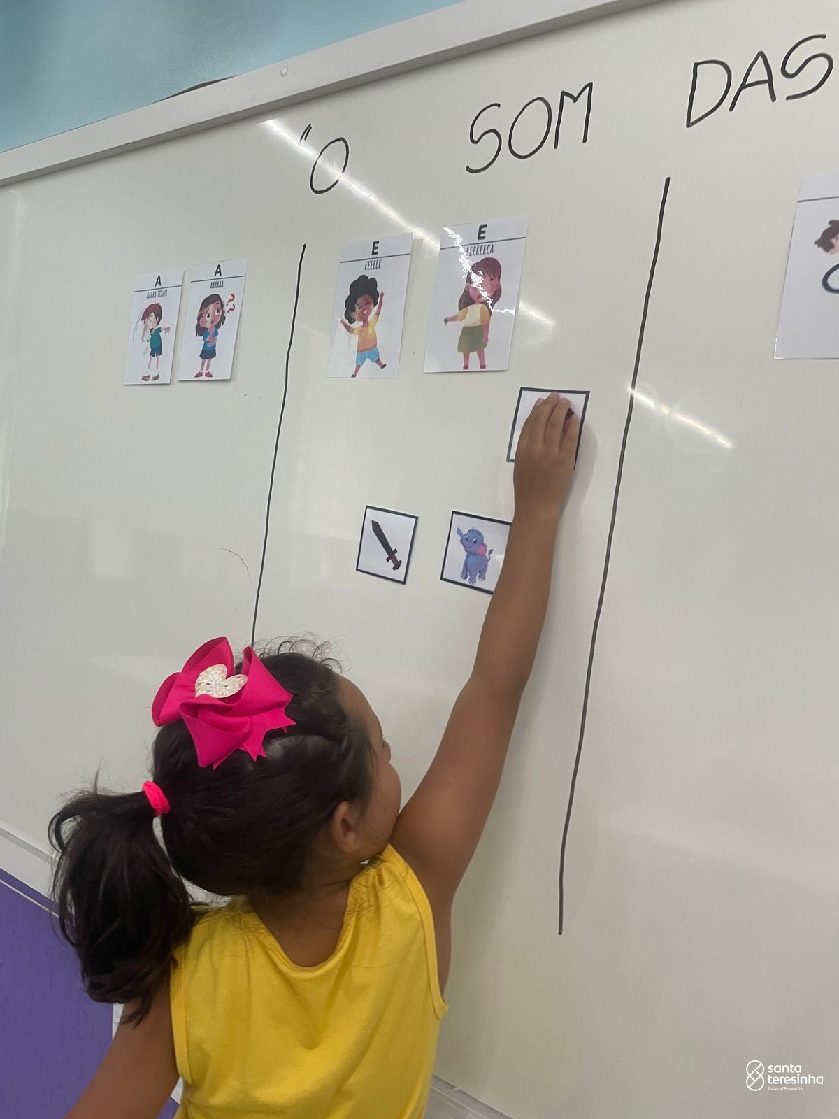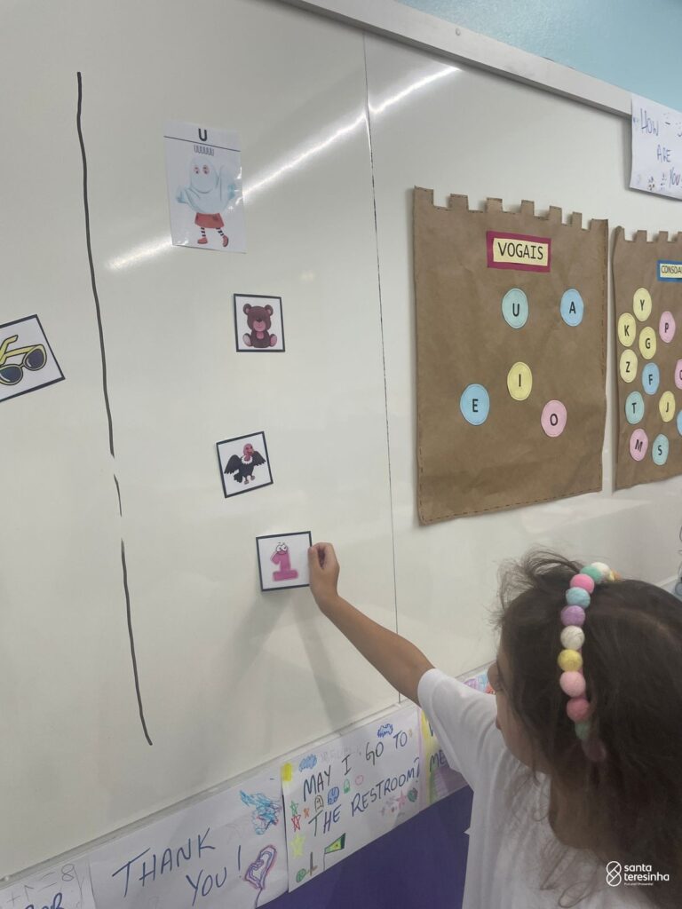 De forma lúdica e divertida a turma do 1° ano B, explorou o som das VOGAIS, através de brincadeira coletiva no quadro!