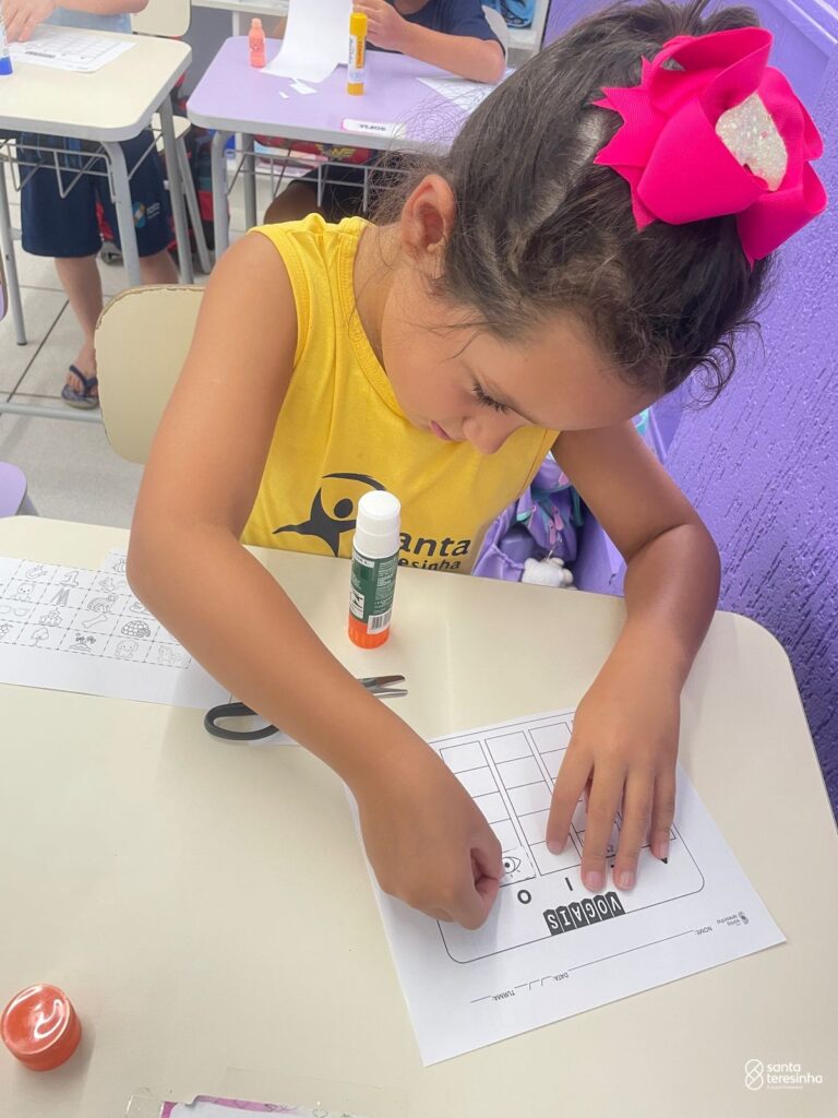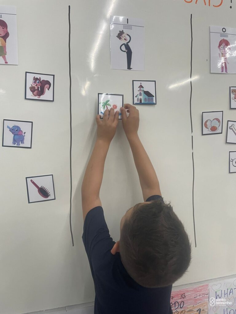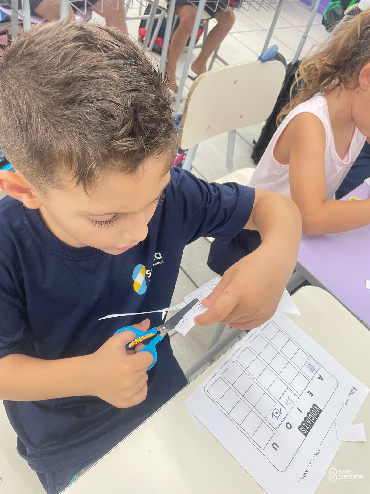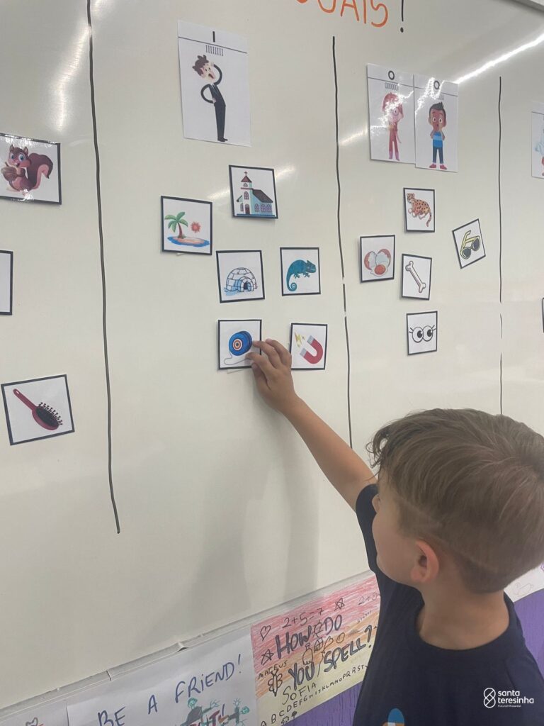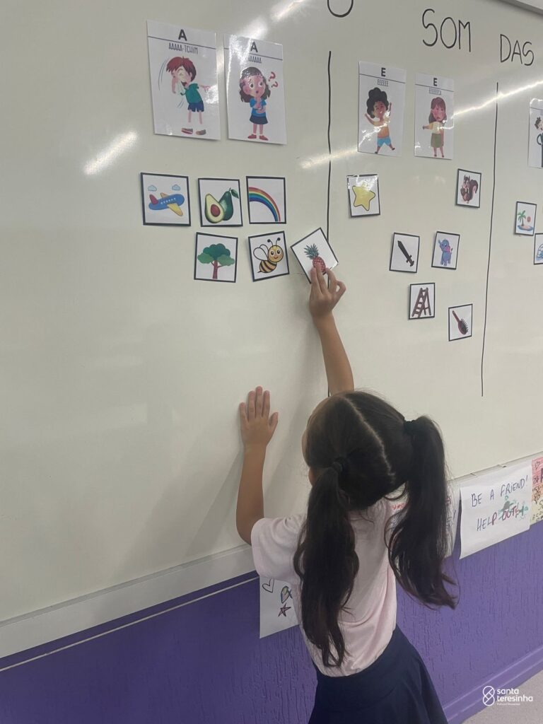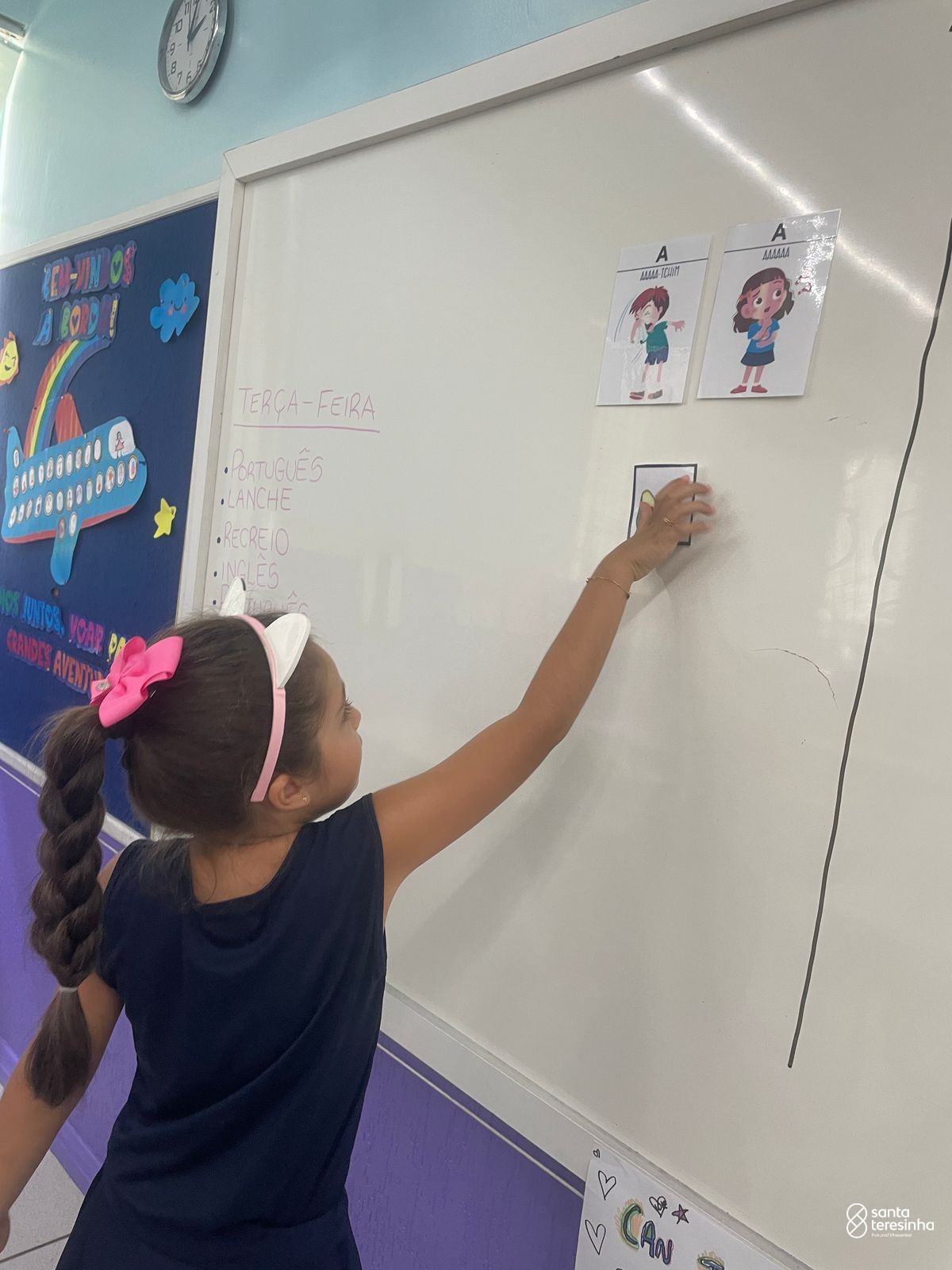 De forma lúdica e divertida a turma do 1° ano B, explorou o som das VOGAIS, através de brincadeira coletiva no quadro!